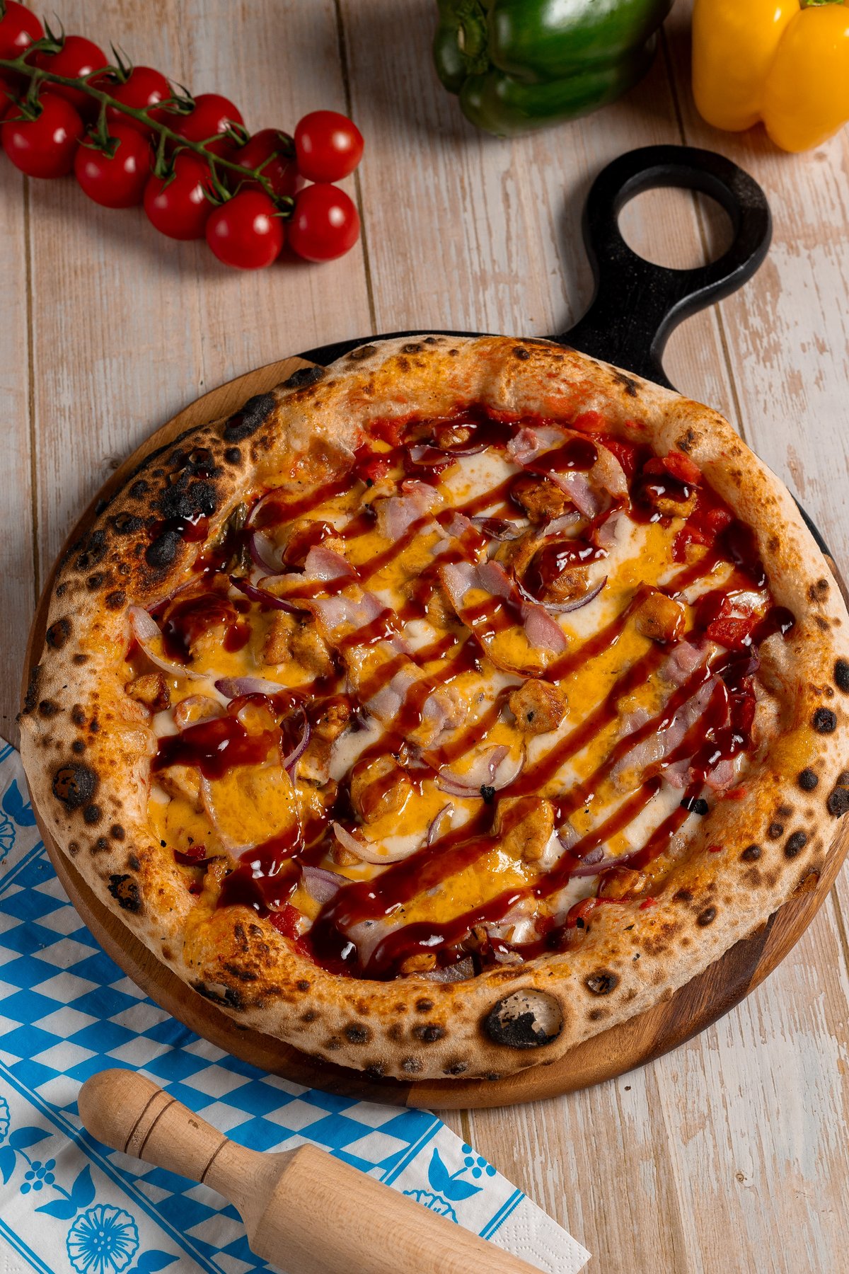(BBQ szósz, omlós sült csirkemell, ropogós bacon, cheddar, mozzarella és lilahagyma)