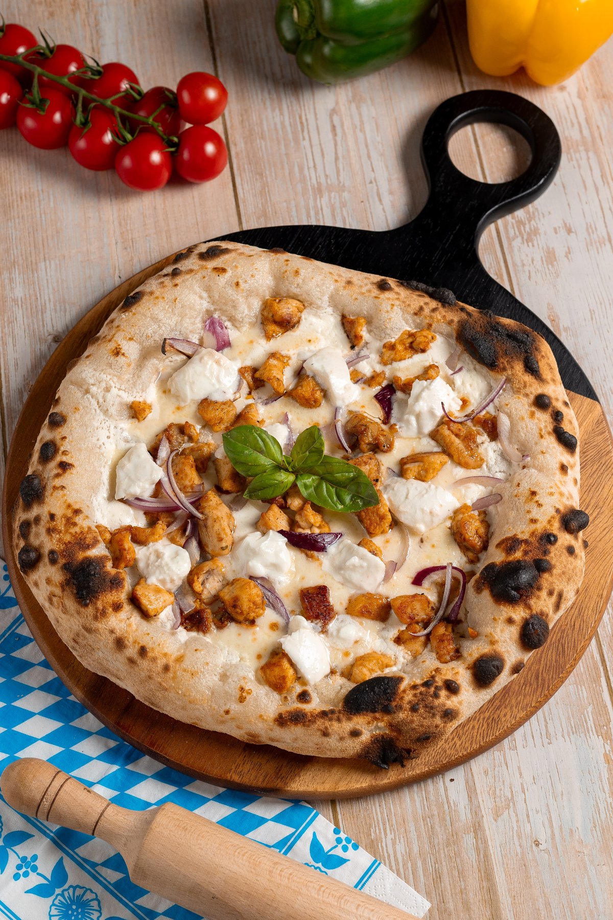 (fokhagymás tejfölös alap, mozzarella, grillezett csirkemell, szarvasi mozzarella golyók, lilahagyma)