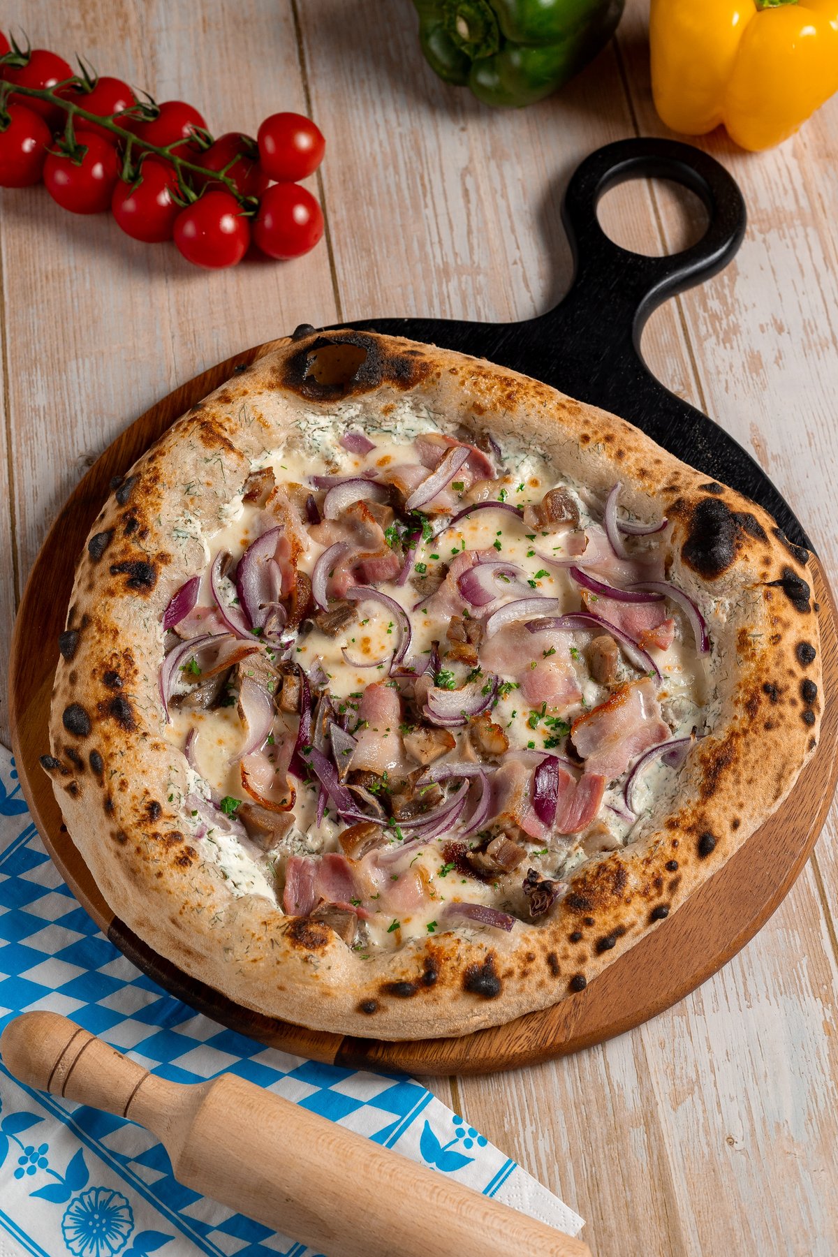 (kapros-tejfölös alap, omlós sült csülök, juhtúró, bacon, lilahagyma és mozzarella)