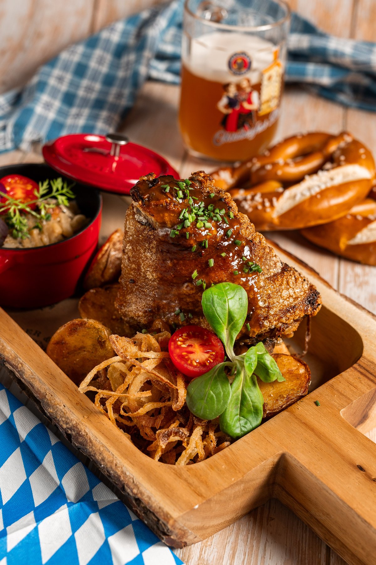 bajor csülök barna sörrel locsolgatva, fűszeres házi sültburgonya, bajor savanyúkáposzta, pecsenyelé, lyoni hagyma / Bavarian pork knuckle sprinkled with brown beer, homemade spicy fried potatoes, Bavarian sauerkraut, jus, crispy lyon onion rings