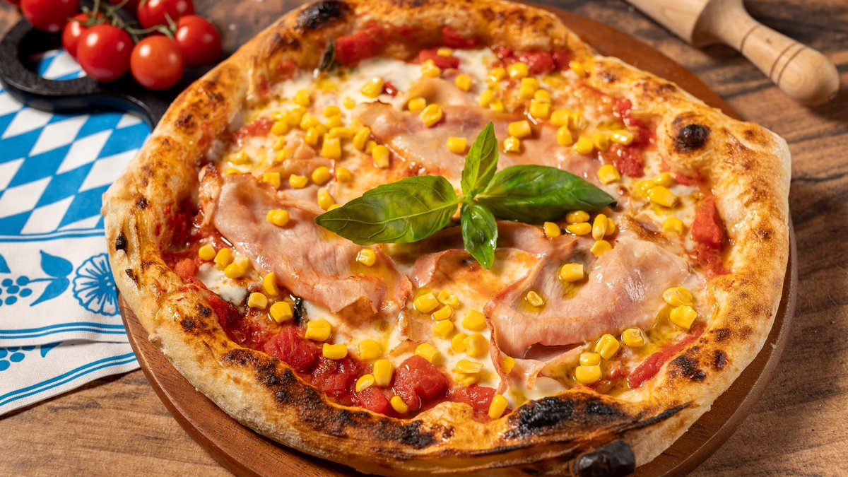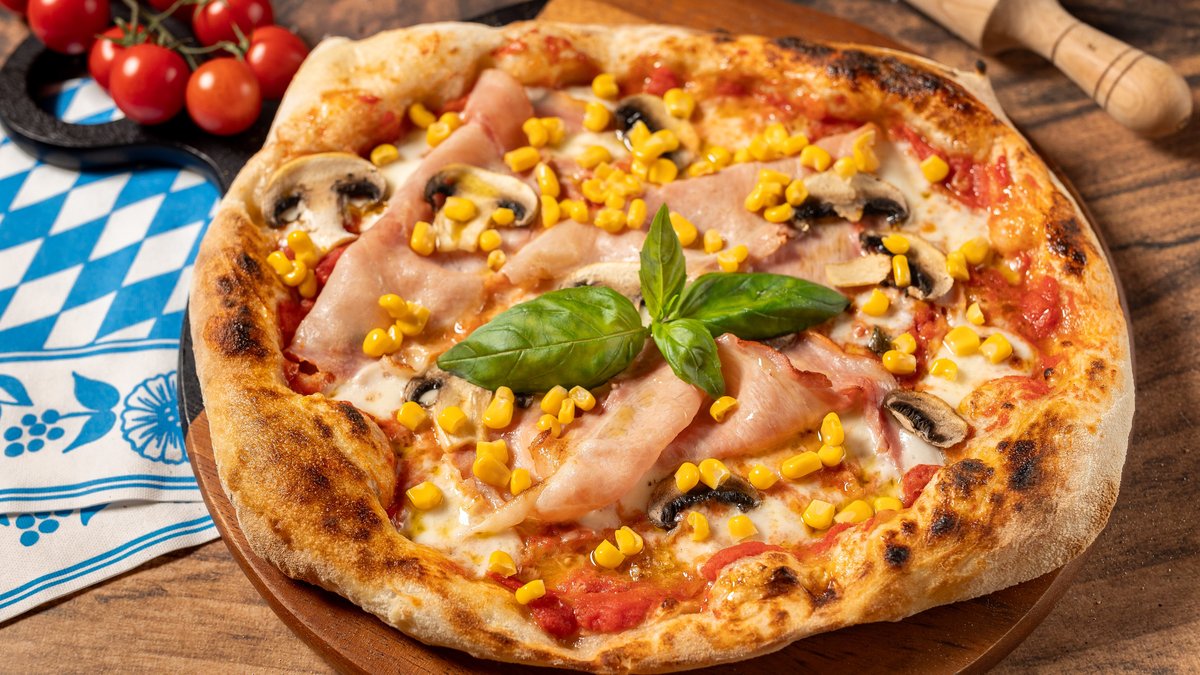 paradicsomszósz, mozzarella, főtt sonka, gomba, kukorica