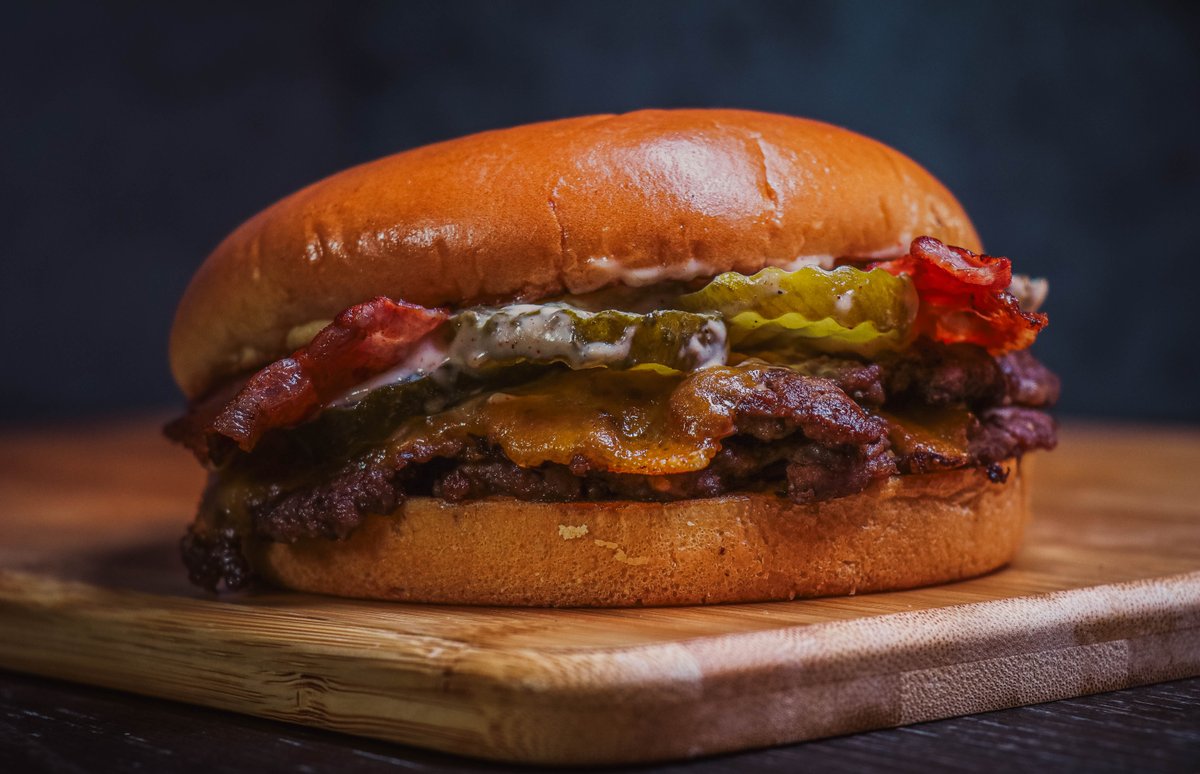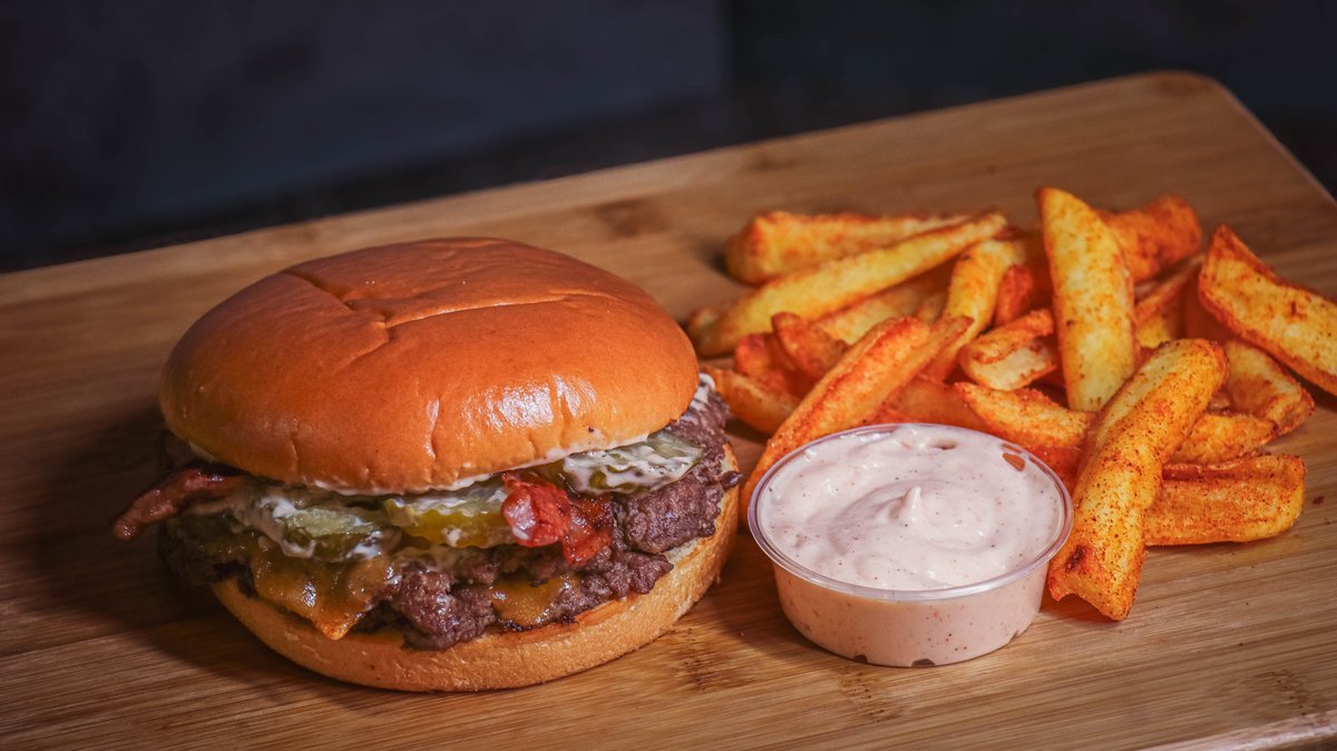 burger buci, 2 db marhahúspogácsa, hagyma, 2 db bacon, 2 db cheddar sajt, savanyú uborka, burger szósz vagy chipotle (pikáns) majonéz