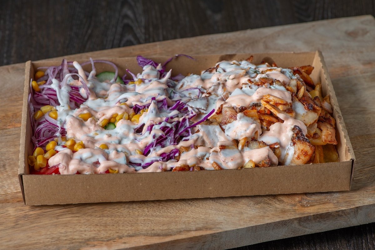 A gyros tál tartalmaz húst, zöldségeket (lilakáposzta, hagyma, uborka, paradicsom, kukorica) és egy adag fűszeres sült burgonyát. Opcionálisan kérhetsz akár sajtot is a tálra!