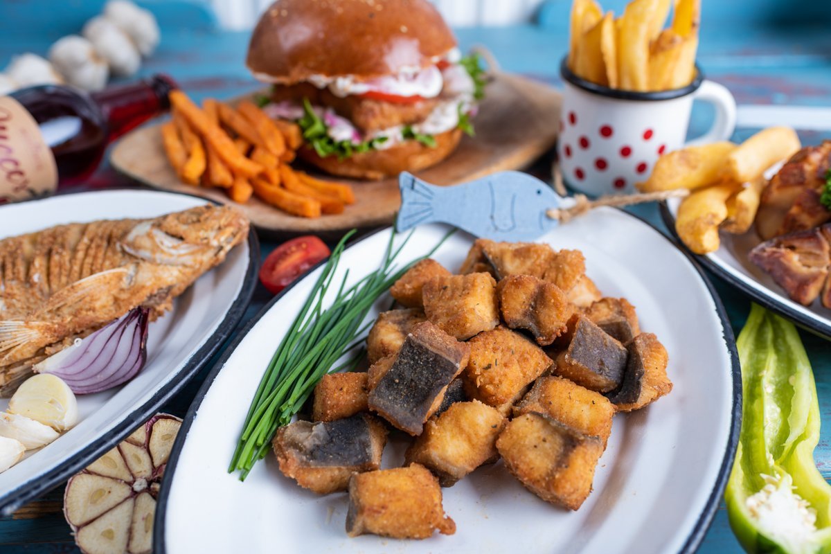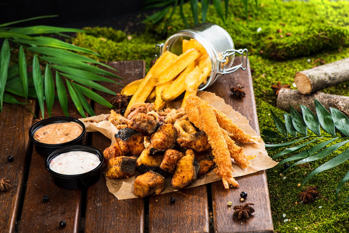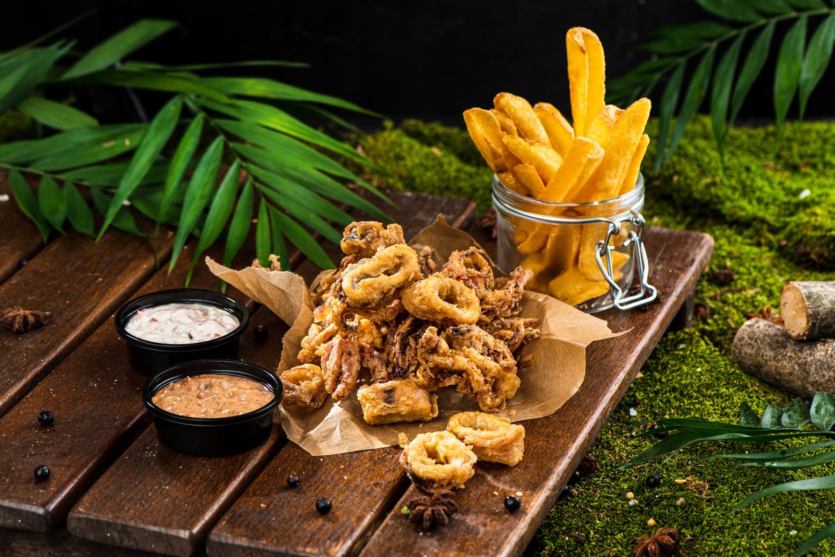 Ropogós garnéla, bébi tintahal, haltepertő, sült burgonya, csúszka, édes chili, fokhagymás majonéz