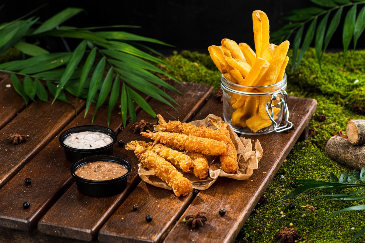 Ropogós garnéla, sült burgonya, édes chili, fokhagymás majonéz