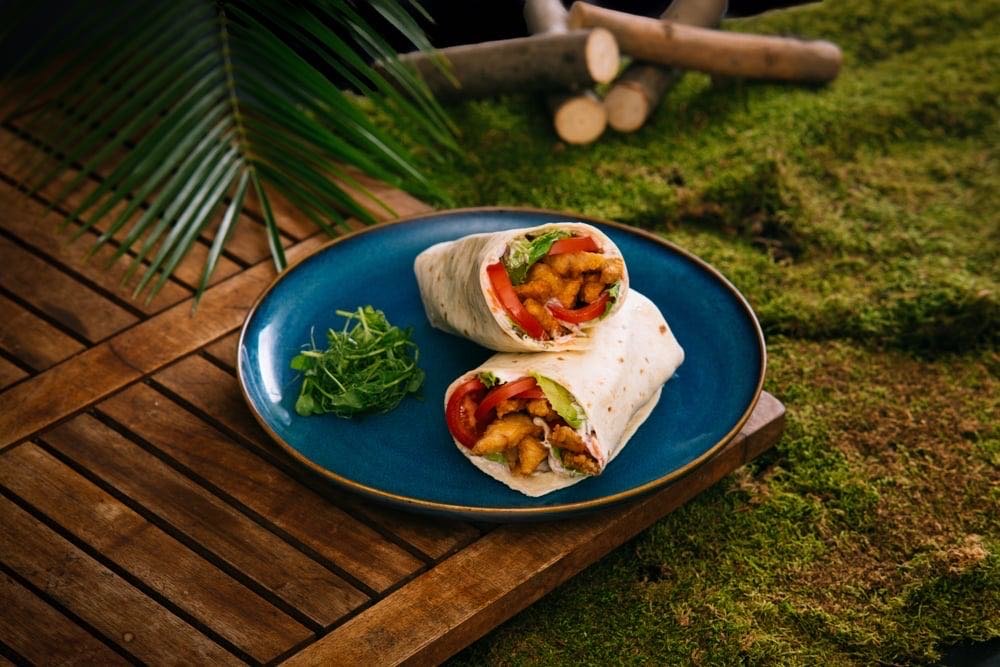 Fűszeres harcsacsíkok, kevert saláta, paradicsom, csúszka, tortilla