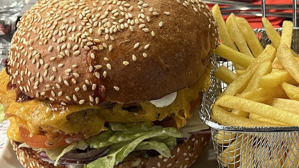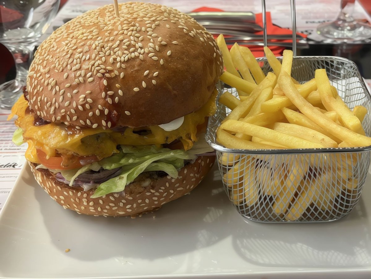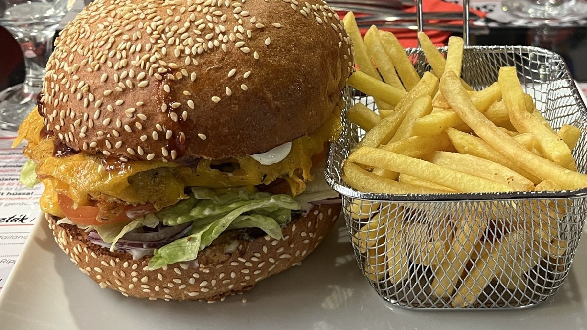 100% Angus marha húspogácsa, jégsaláta, csemegeuborka, paradicsom,bacon,pirított hagyma,cheddar sajt, BBQ szósz, hasábburgonya.