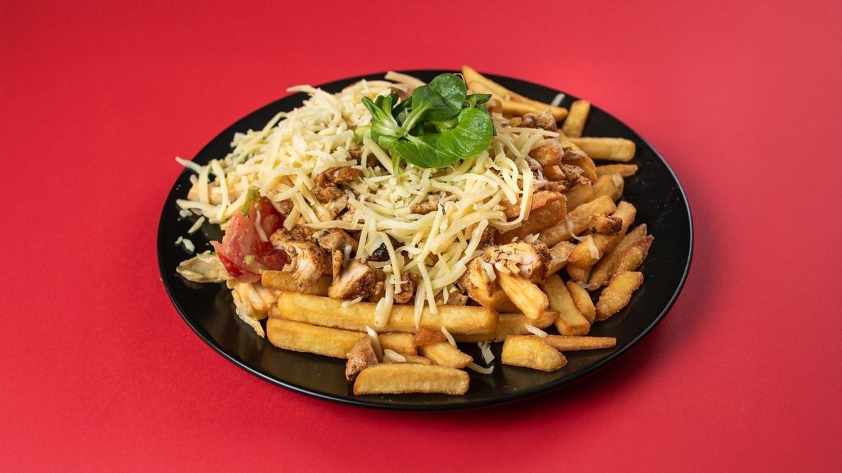 tortilla, cheedar sajt, jalapeno, lilahagyma, paradicsom, csirkemell, hasábburgonya.