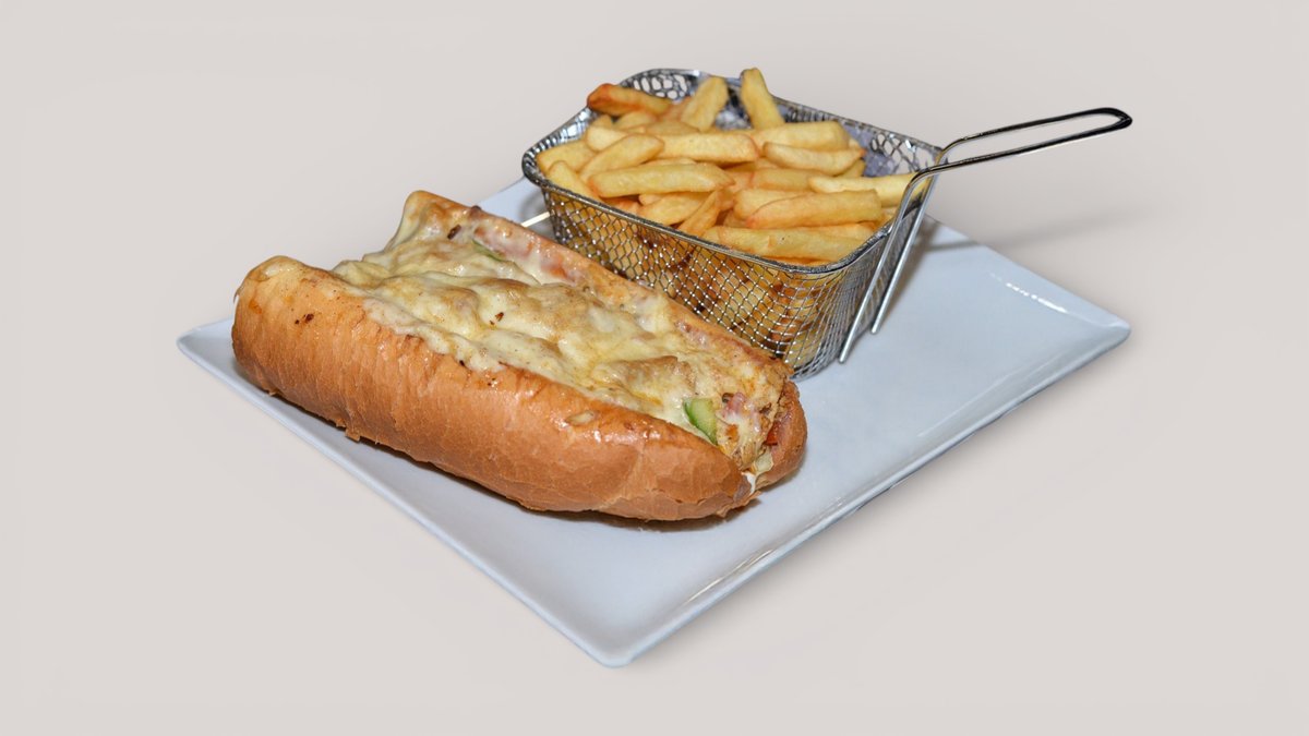 bagett, roppanós virsli, pirított hagyma,csemegeuborka, ketchup, mustár, sajt, hasábburgonya.