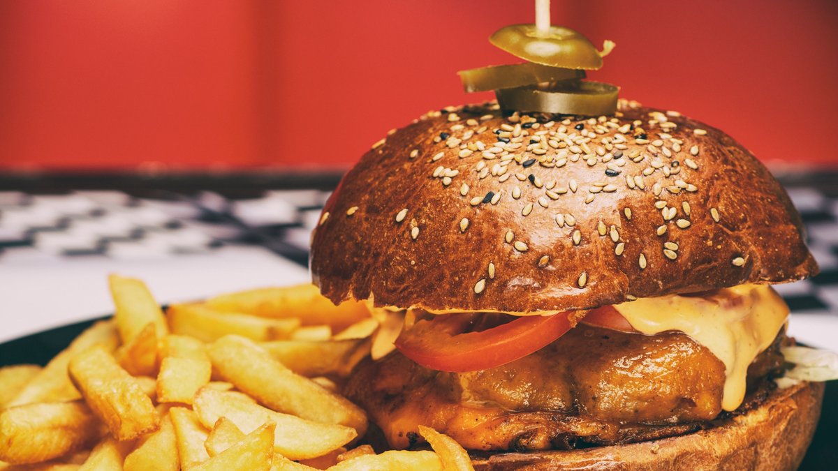 100% Angus marha húspogácsa, szezámmagos buci, jégsaláta, paradicsom, lilahagyma chutney, mézes mustár, hasábburgonya.