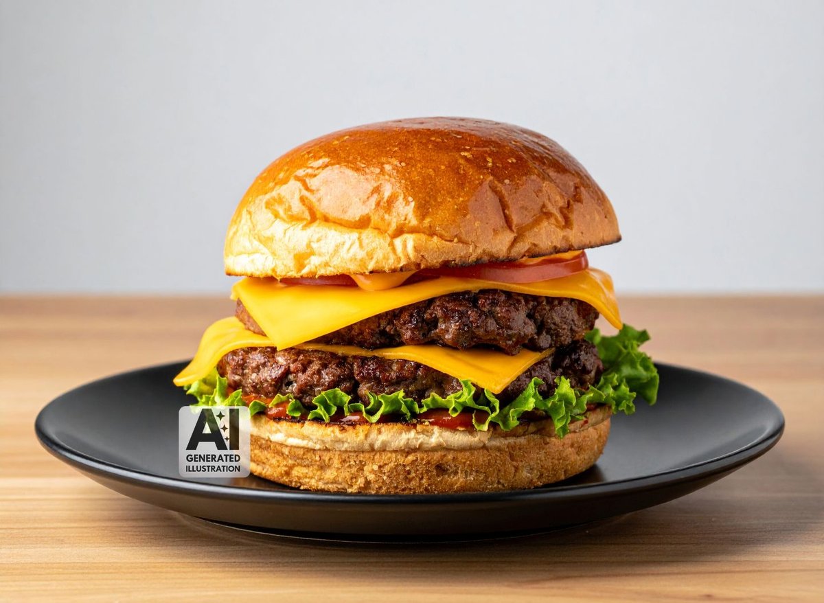 dupla 100%-os Angus marhahúspogácsa, dupla cheddar sajt, dupla bacon, rántott cheddar sajt korong, rántott hagymakarika, lilahagyma, csemegeuborka, paradicsom, mustár, BBQ szósz