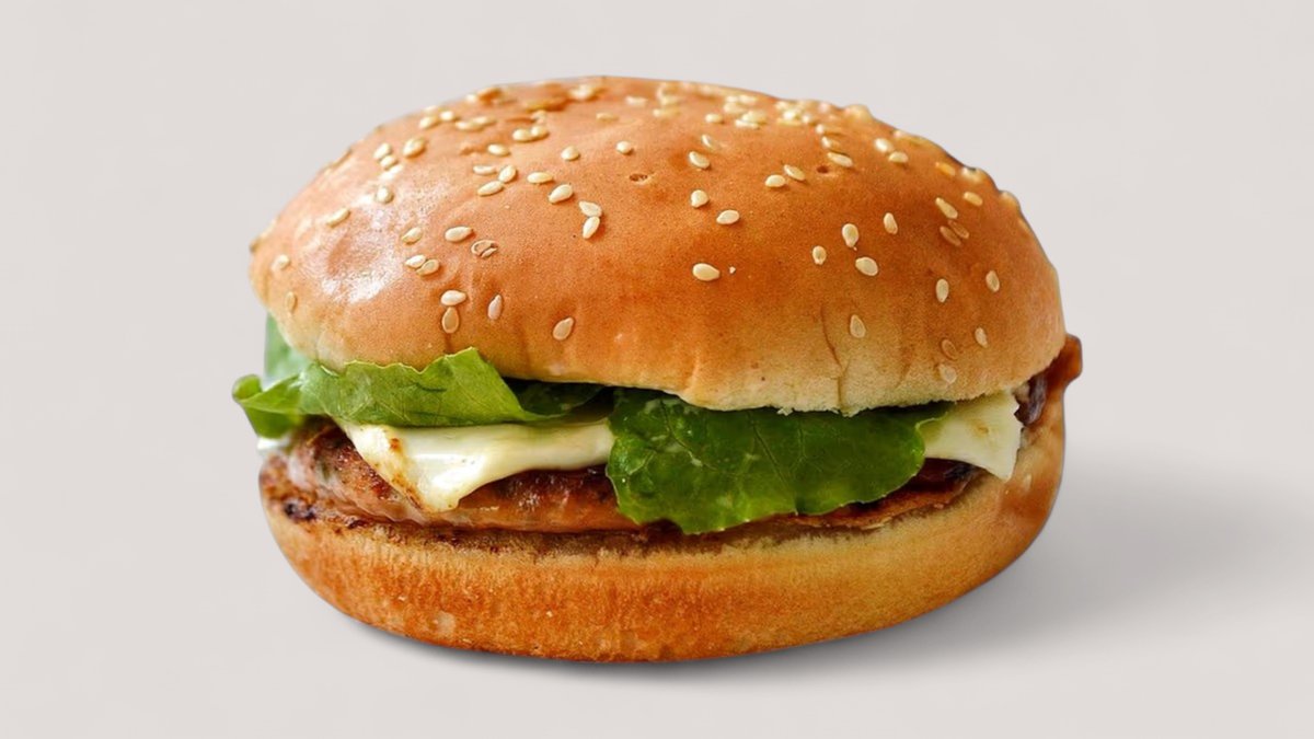 Két finom csirke pogácsa, friss zöldségek és cheddar sajt puha, finom zsemlében.