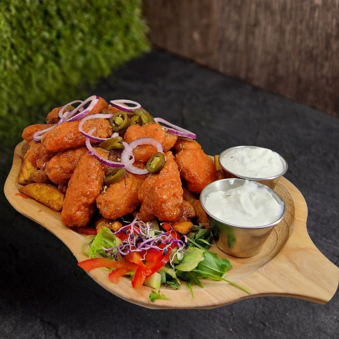 6db csirkeszárny, 5db csirkemell csík, közepes sült burgonya, 2db választható szósz, friss saláta
