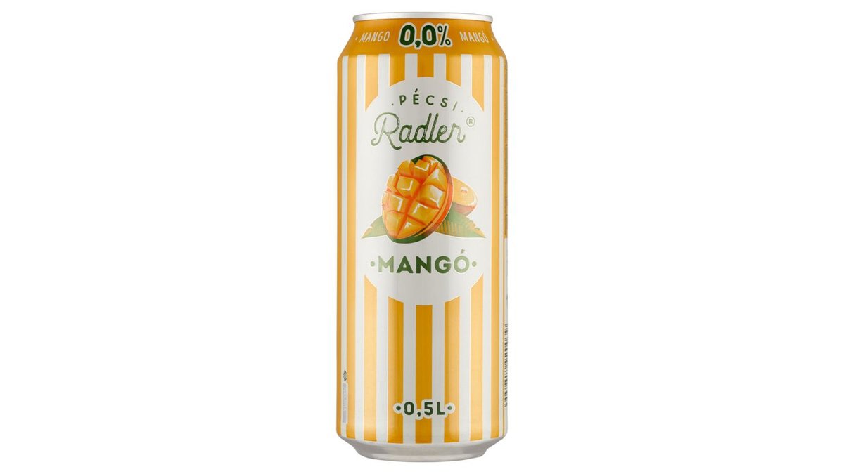 HUF 749Pécsi Radler Mangó alkoholmentes világos sör és mangó ízű szénsavas üdítőital keveréke 0,0% 0,5 l