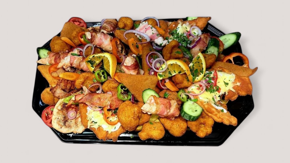 Tartalma: 6db rántott csirkemell, 6db Dunakeszi borzas, 6db rántott sajt, 6 adag rántott gomba. Vegyes köret: rizs, hasábburgonya