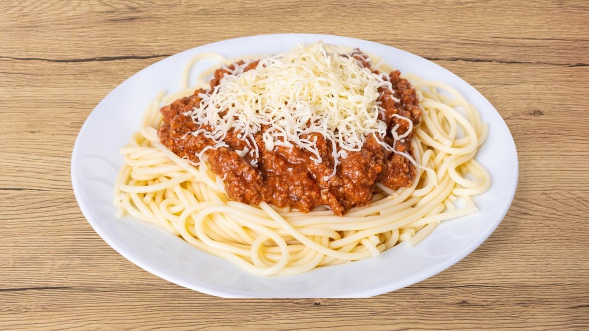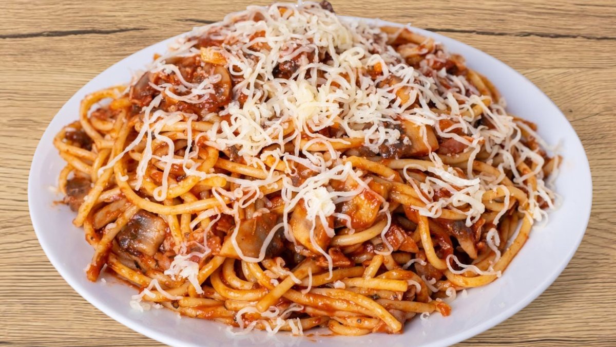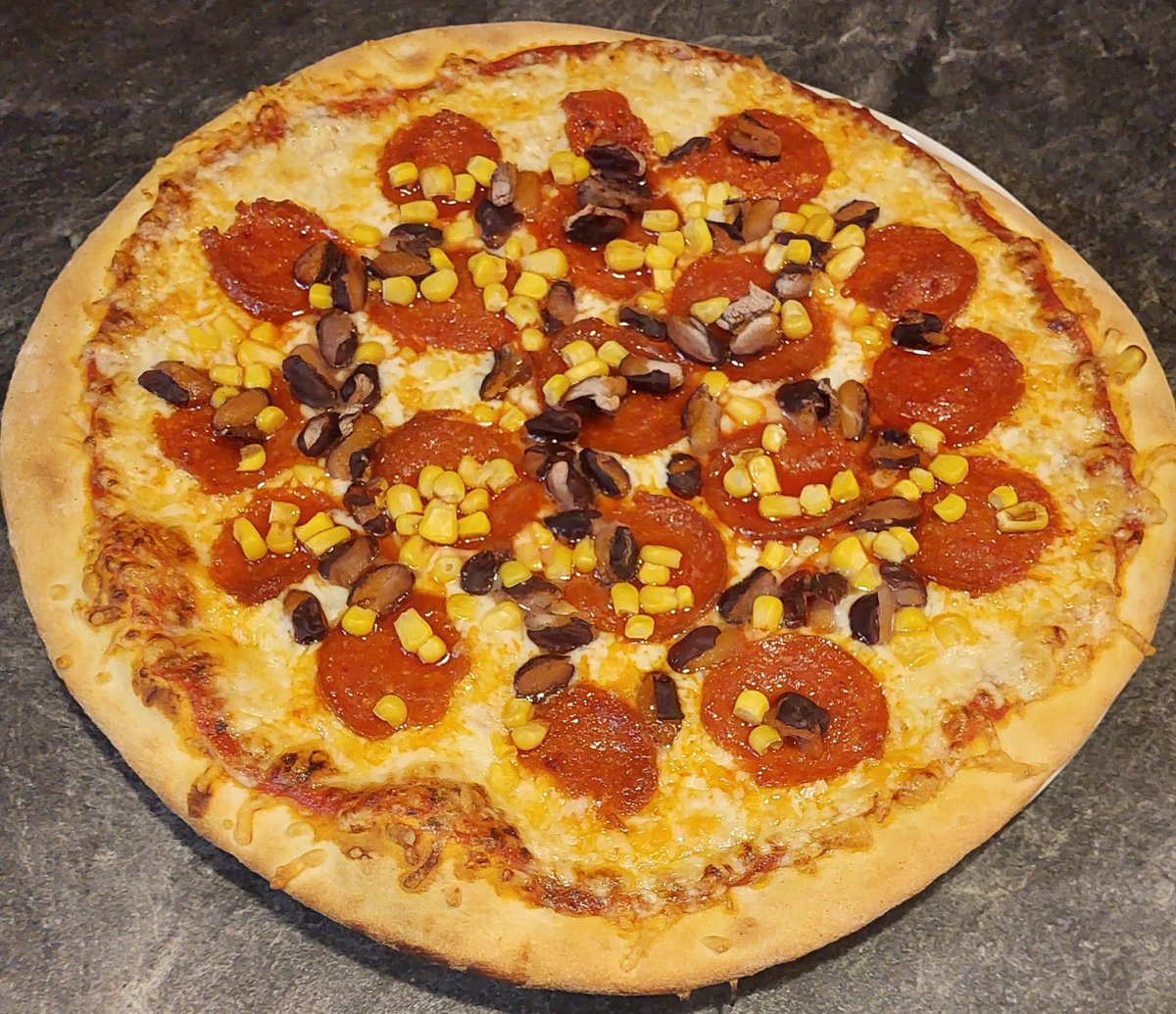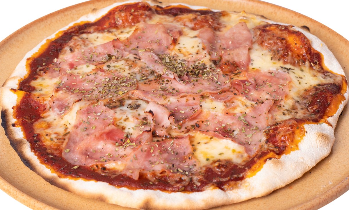 paradicsomszósz, csípős kolbász, bacon, hagyma