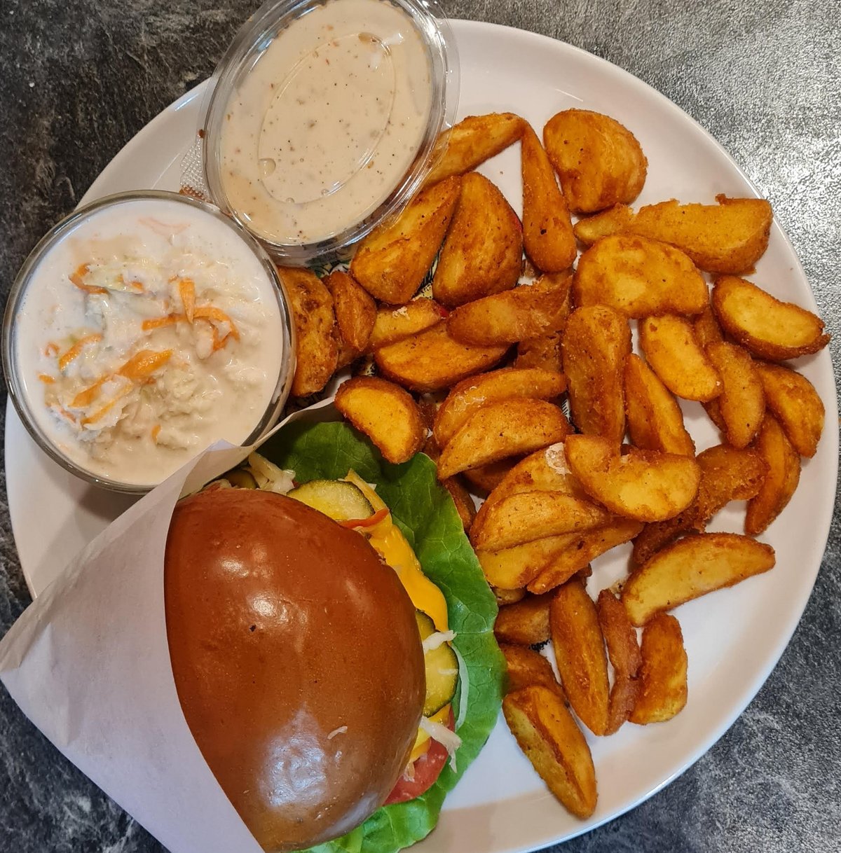 Sajtburger, steak burgonya, coleslaw saláta, szósz