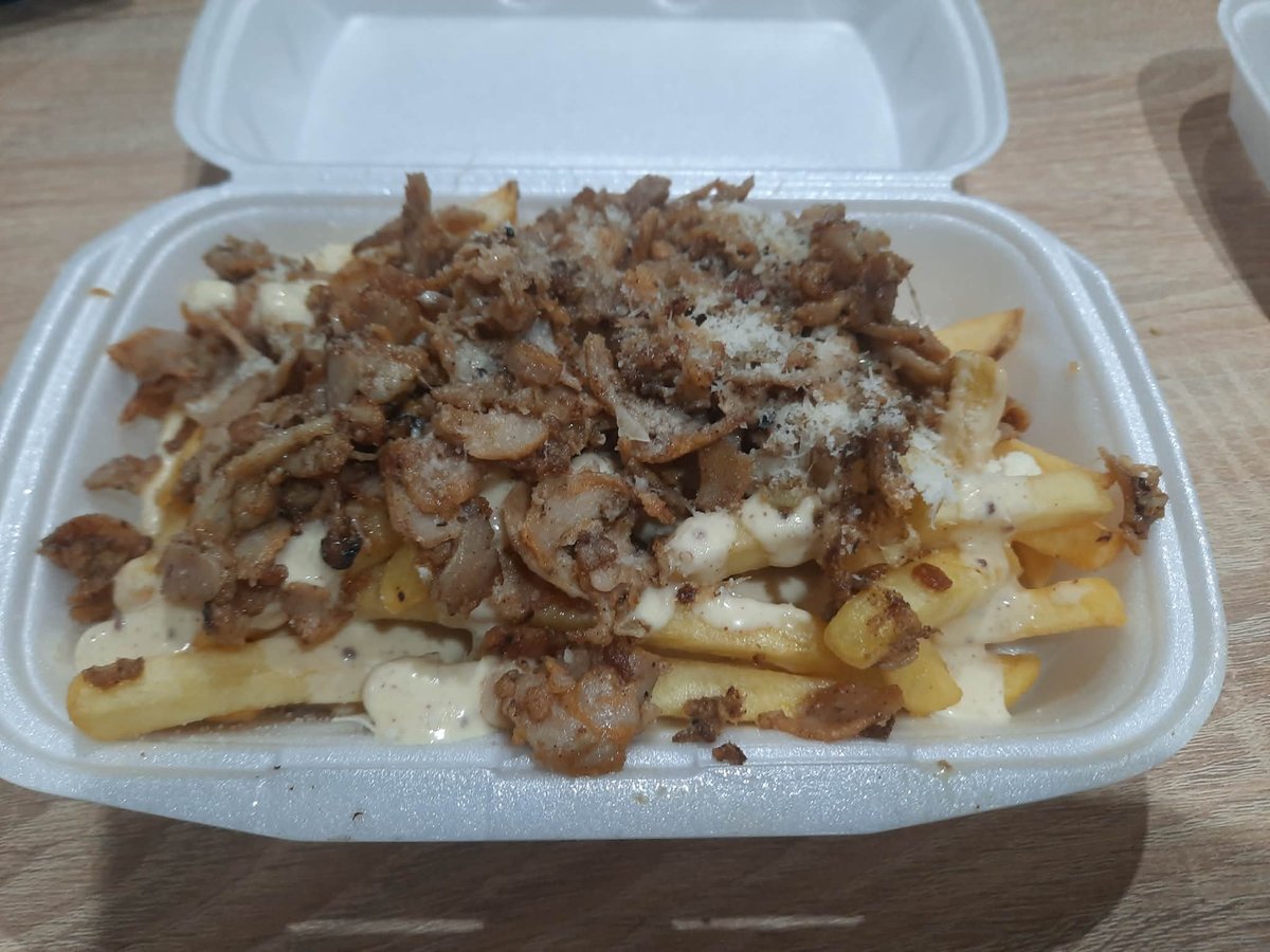 Burgonyát megforgatom fokhagymás sült hús ízű tepertős zsírban, majd meglocsolom majonézes-mézes-mustáros szósszal. Erre kanalazom a rostlapon megsütött csirkecomb húsból készült gyros húst, amit parmezán sajttal sütök össze. Tetejét újra megszórom parmezán sajttal.