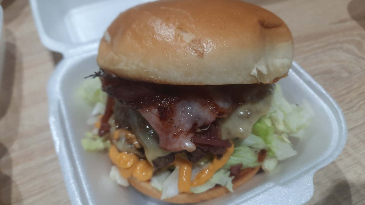 A 15 dkg 100 % marha húspogácsát meglocsolom fokhagymás sült hús ízű tepertő zsírral, majd általunk készített pikáns mustáros cheddar sajttal együtt médiumra sütöm. Sült hagymás szósszal megkenem a hamburgerpogácsát, erre roppanós salátalevelet teszek. Ráhelyezem a médiumra sült szaftos húst. Saját készítésű bacon raguval és barbecue szósszal meglocsolom.