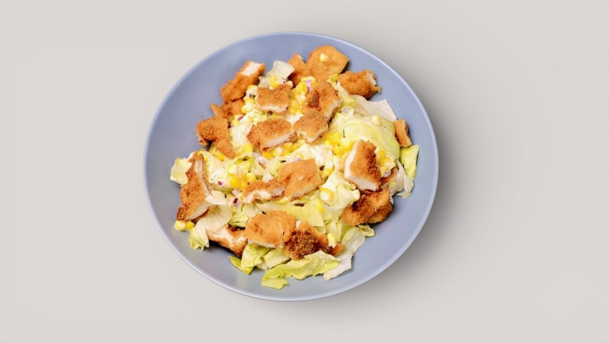 Jegsaláta, kukorica, tartár ,rántott csirkemell csíkok