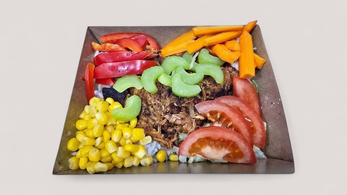 Pulled Pork, Rizs, Jégsaláta, Paradicsom, Sárgarépa, Bab, Kukorica, Kaliforniai paprika, Zeller, Joghurtos szósz