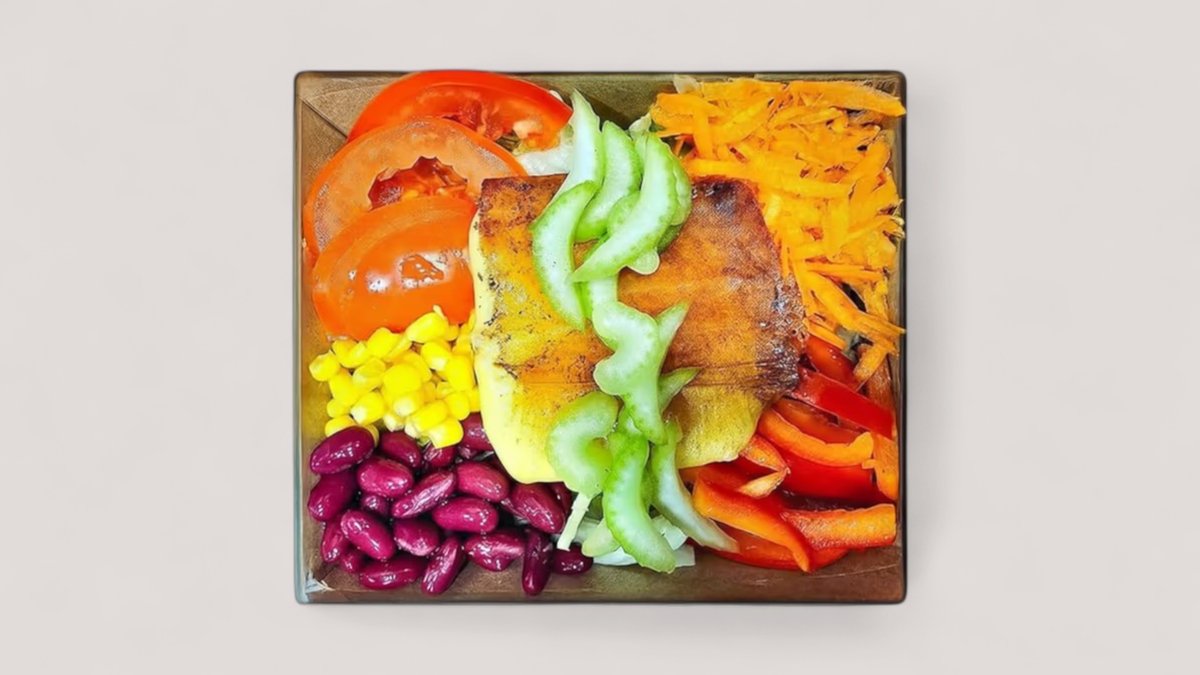 Lazac, Rizs, Jégsaláta, Paradicsom, Sárgarépa, Bab, Kukorica, Kaliforniai paprika, Zeller, Joghurtos szósz