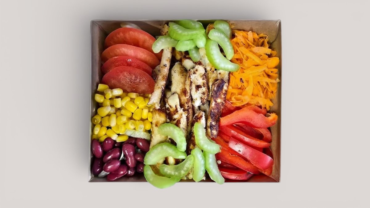 Roston Sült Csirkemell, Rizs, Jégsaláta, Paradicsom, Sárgarépa, Bab, Kukorica, Kaliforniai paprika, Zeller, Joghurtos szósz