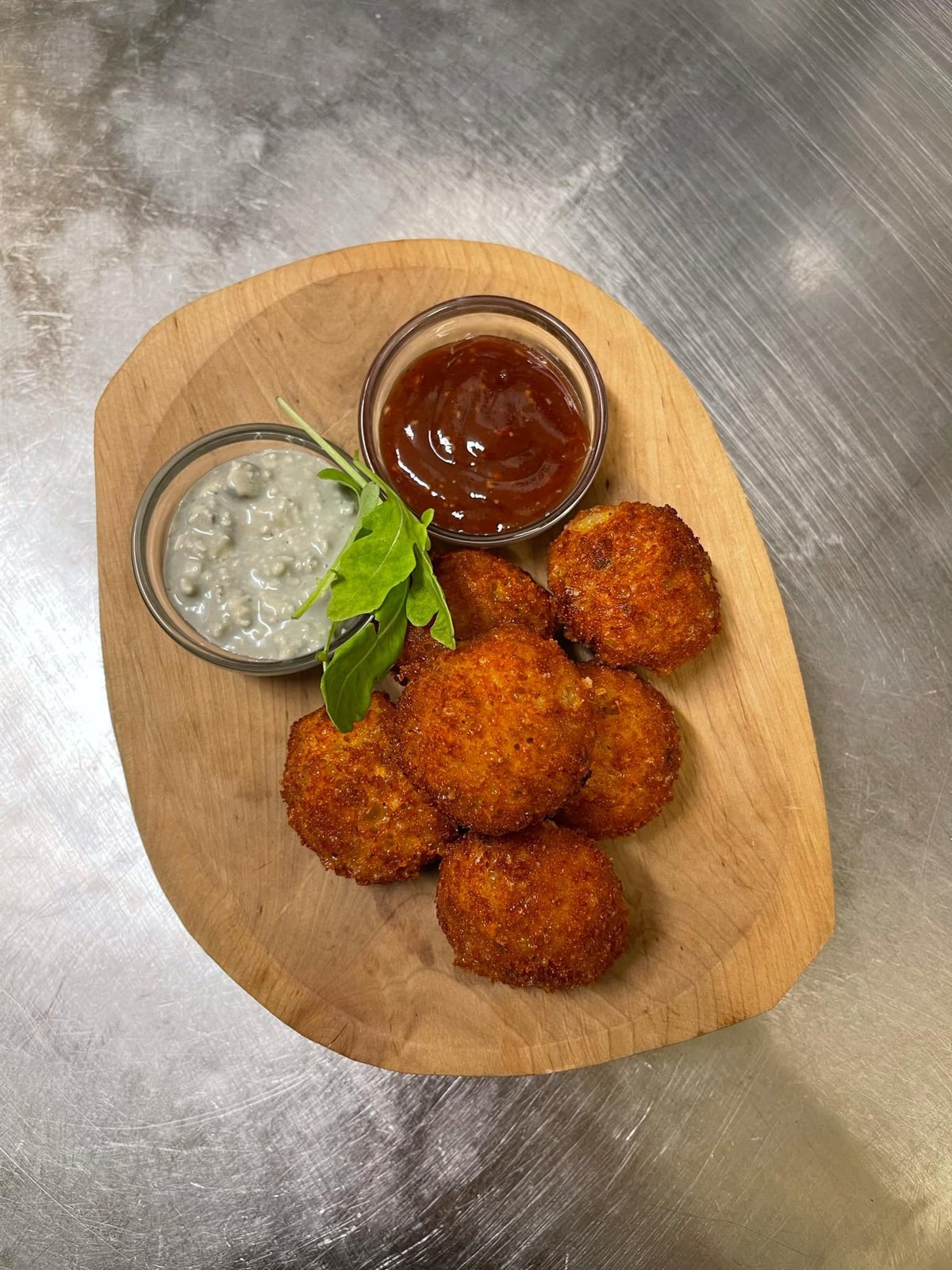 hagymakarikák, csípős sajtgolyó, fűszeres BBQ csírkeszárnyak, texas panírban sült csirkemellcsíkok, héjában sült burgonya, spenótos-sajtkrémes keverék parmezános ropogóssal