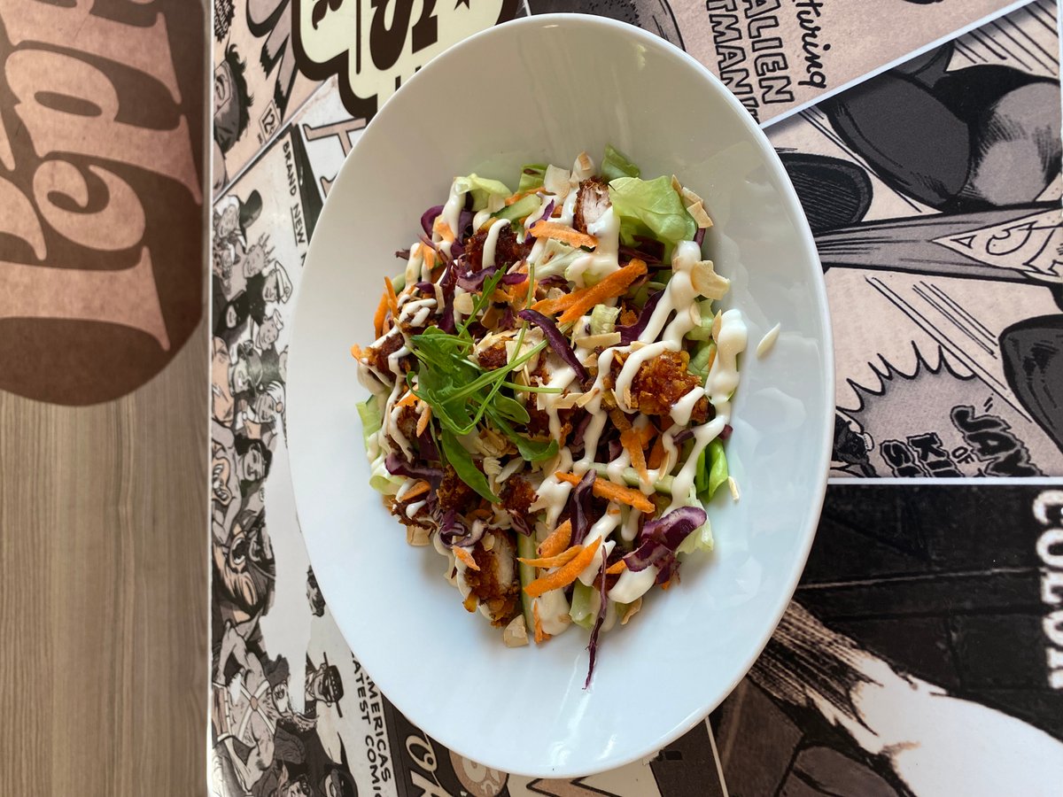 lila káposzta, friss saláta, uborka, texas panírban sült csirkemellcsíkok, pirított mandula, mézes oriental öntettel