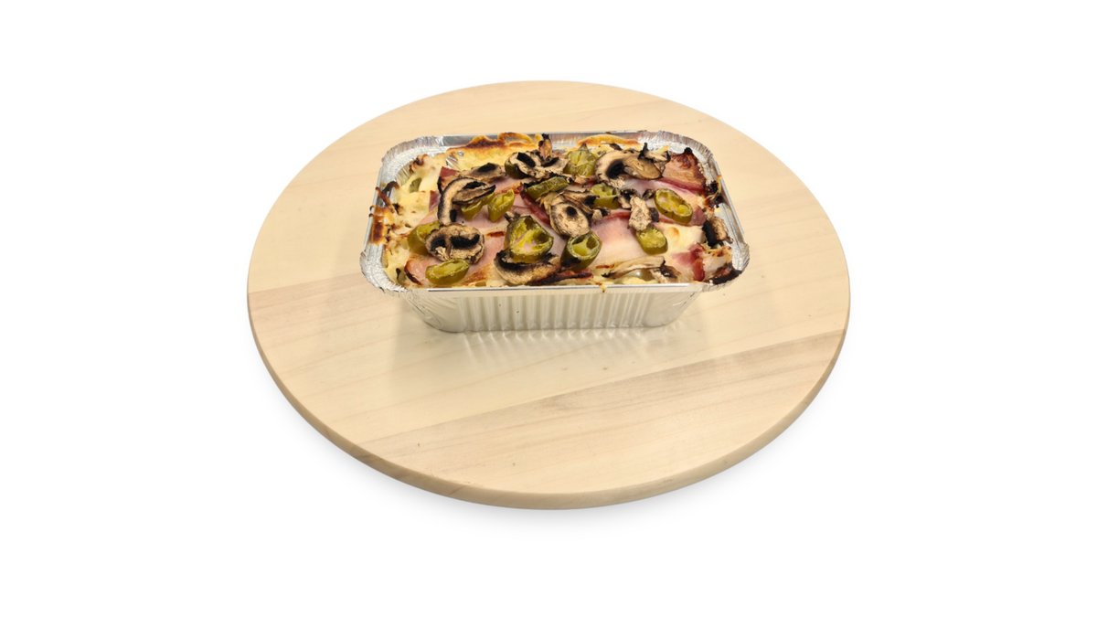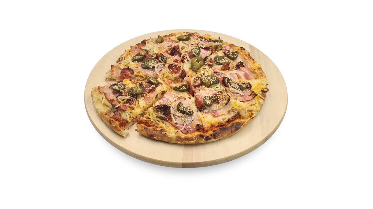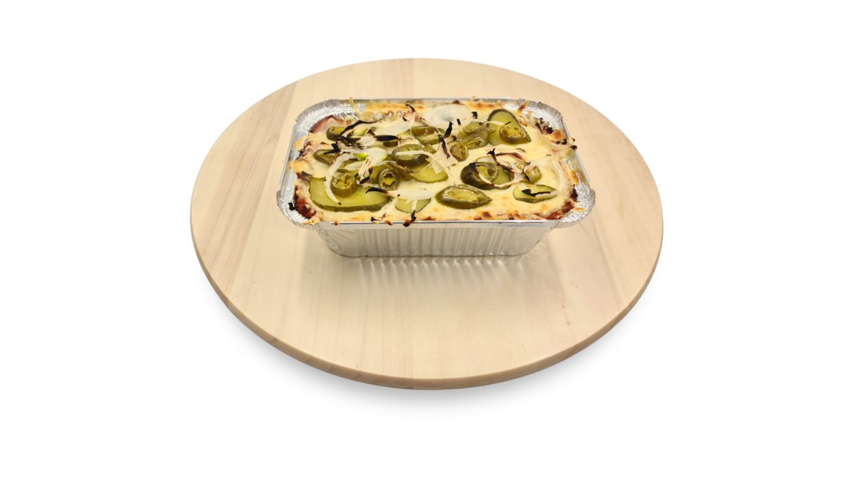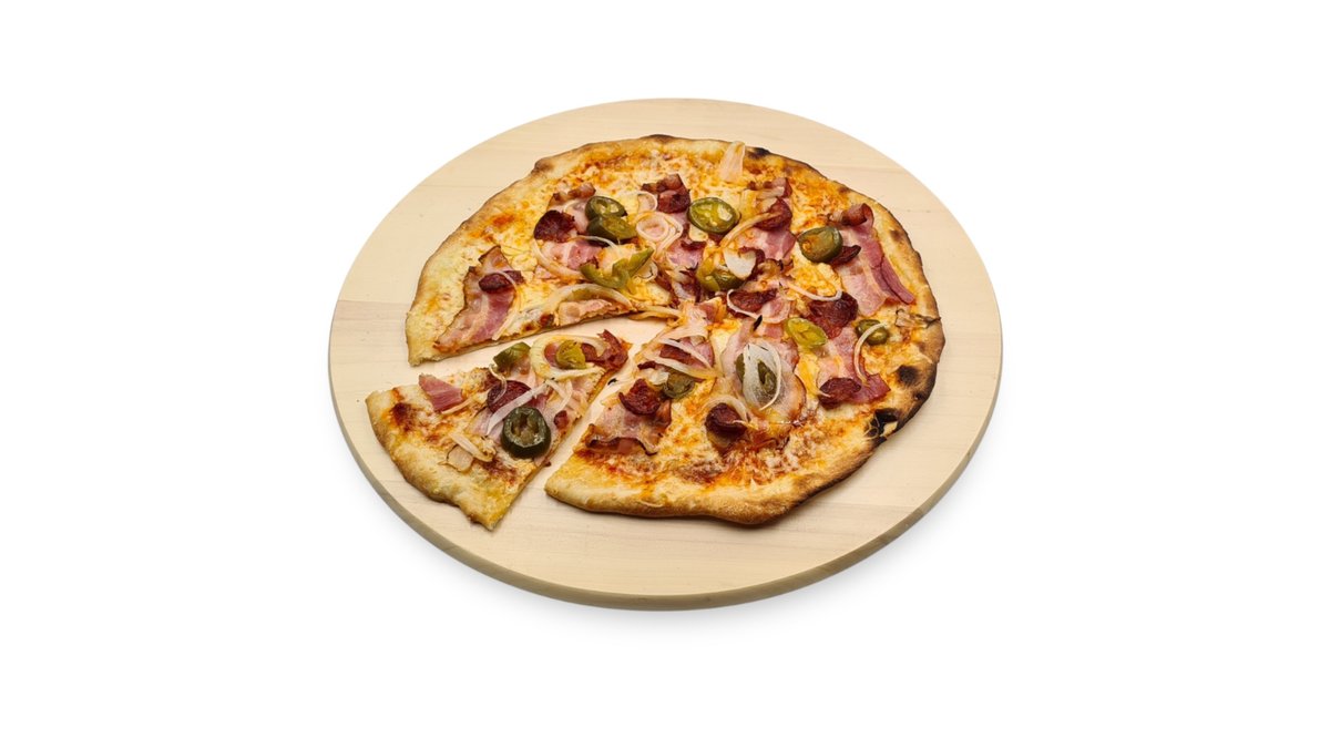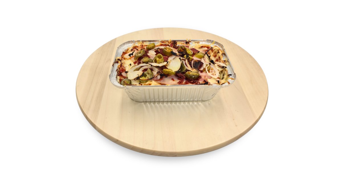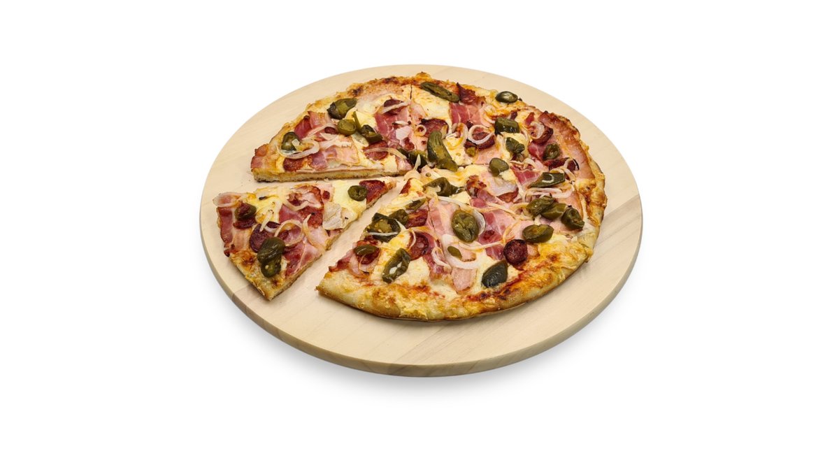 Májkrémes-tejfölös-darálthúsos alap, sonka, sajt, gomba, hagyma, majonéz, chili, jalapeno paprika, spagetti tészta