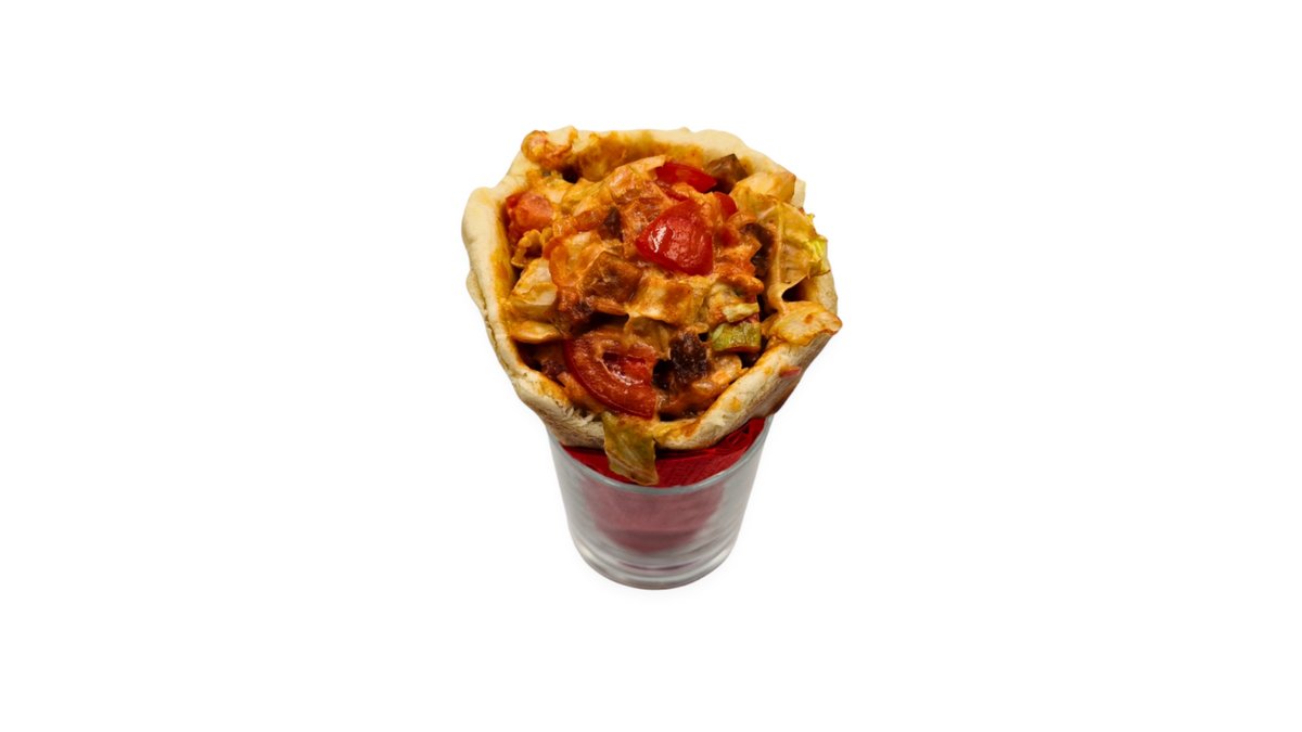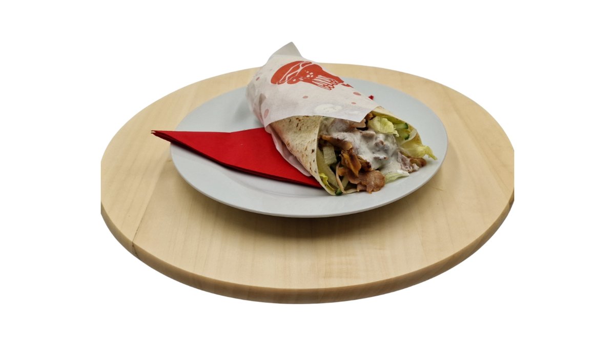 Gyros-hús, kapros-fokhagymás öntet, paradicsom, lilahagyma, jégsaláta, sültkrumpli