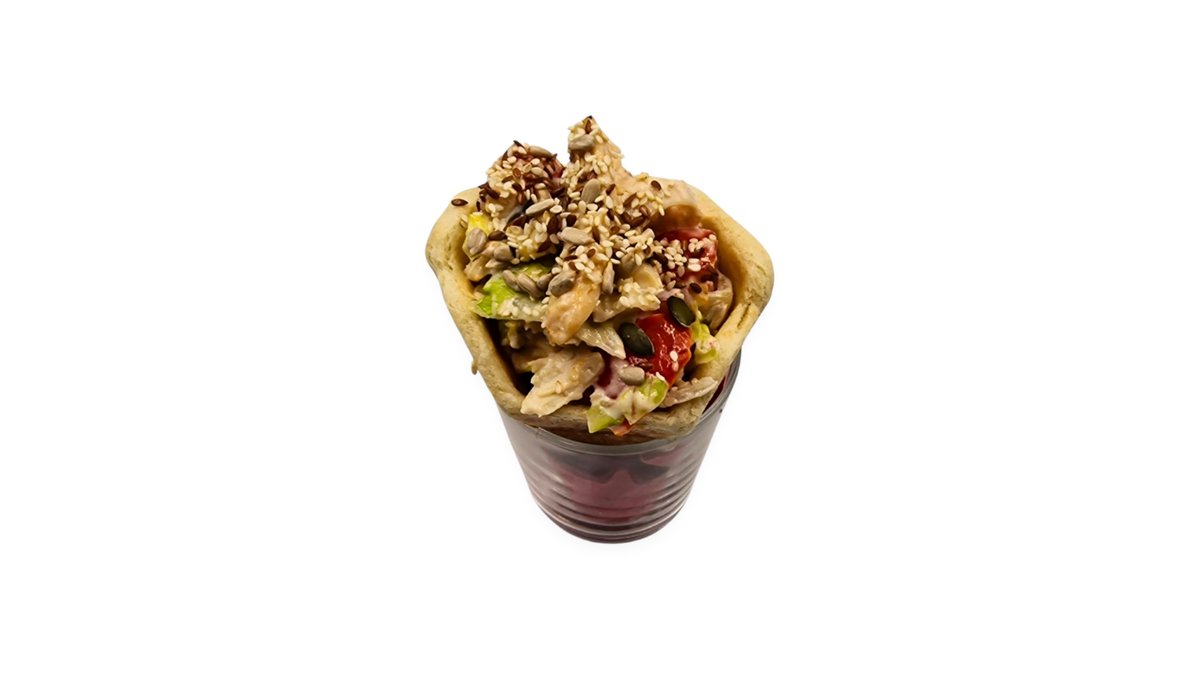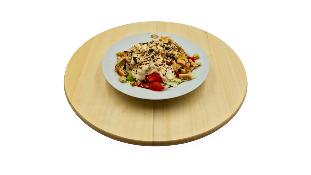 Jégsaláta, paradicsom, roston csirkemell csíkok, majonéz, szezámmag, tökmag, napraforgómag, lenmag