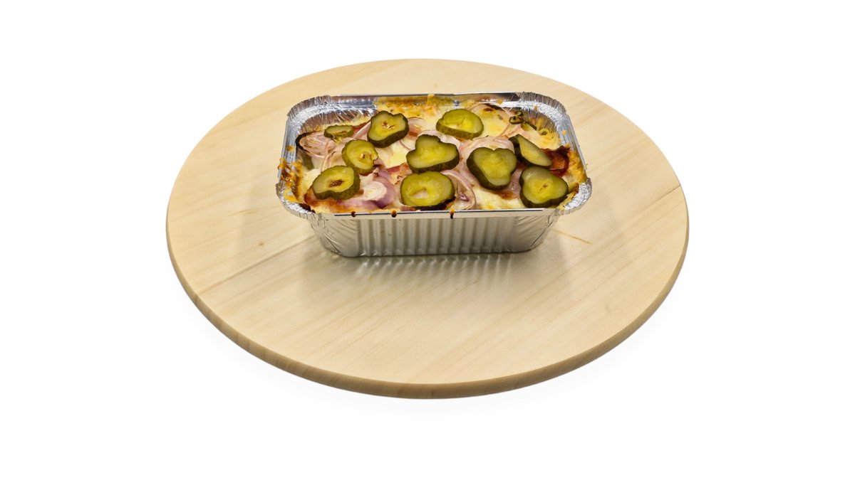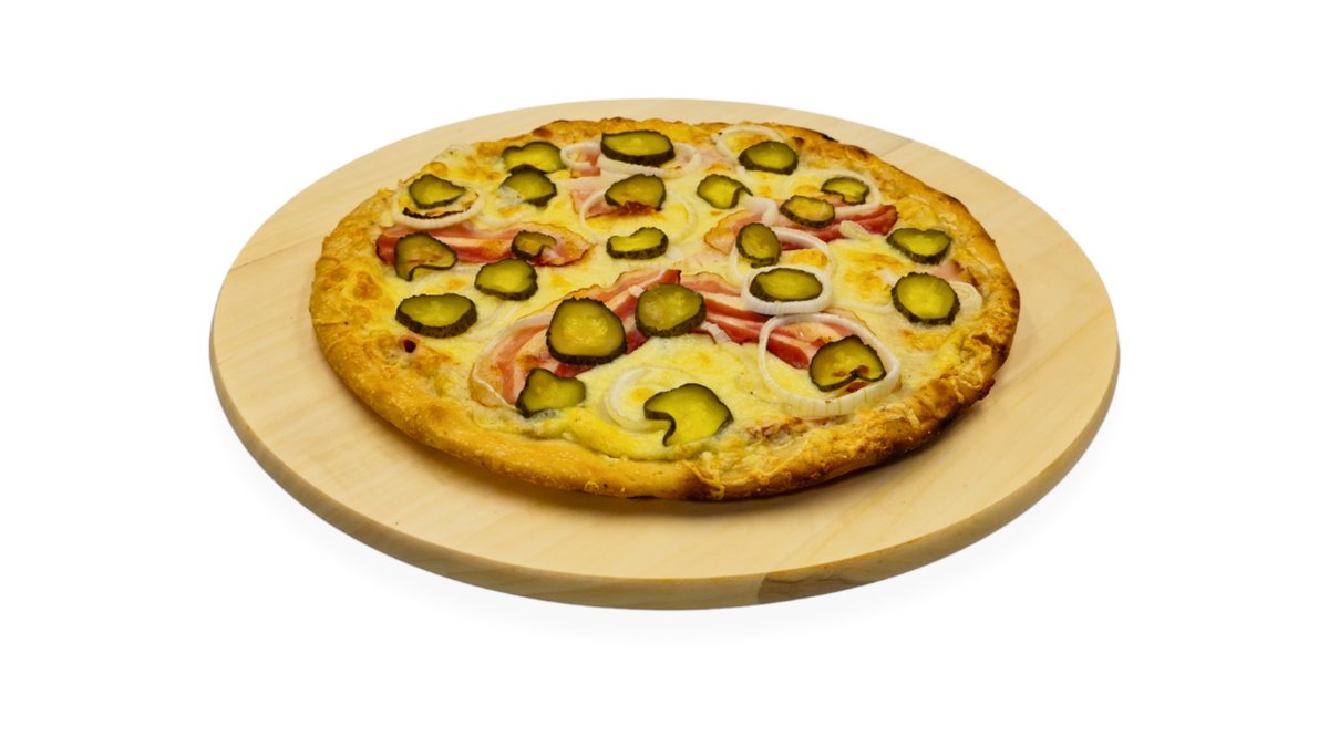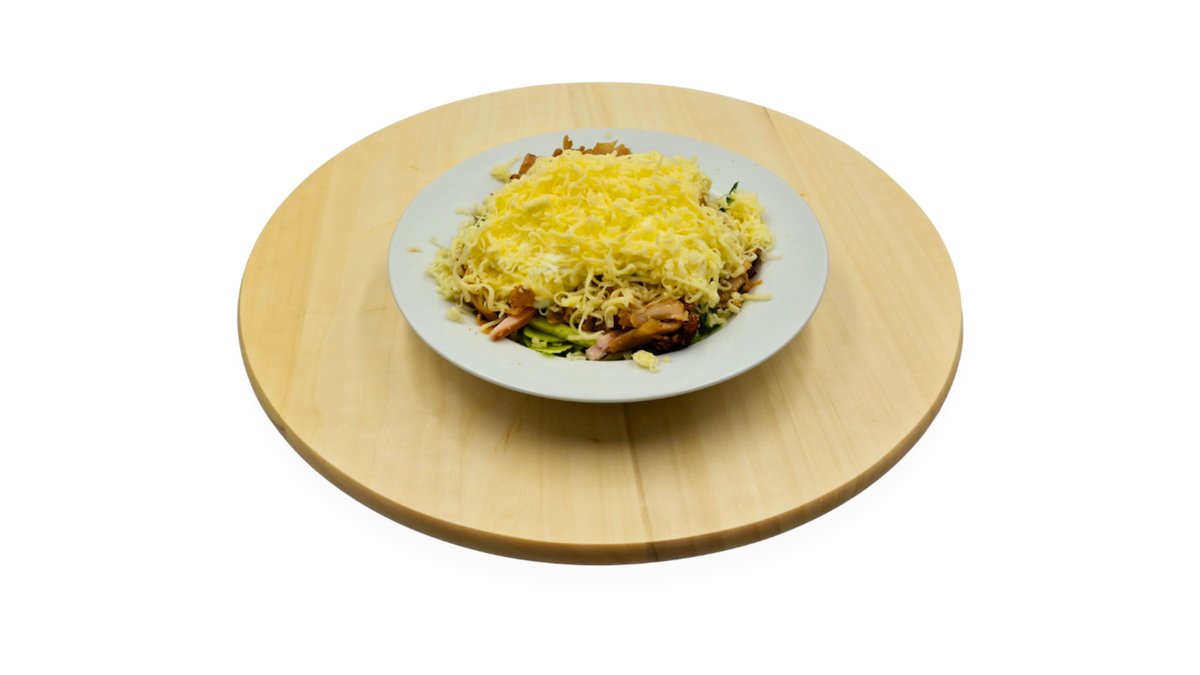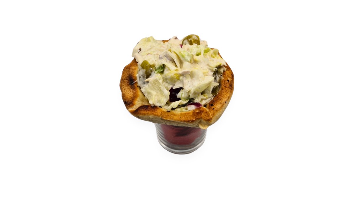 Tejszínes csirke, sonka, sajt, hagyma, szalonna, savanyú uborka, saláta