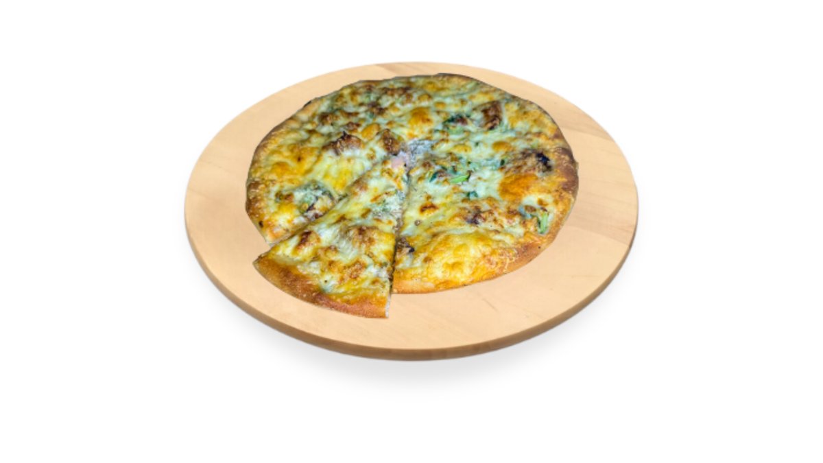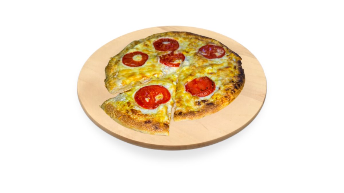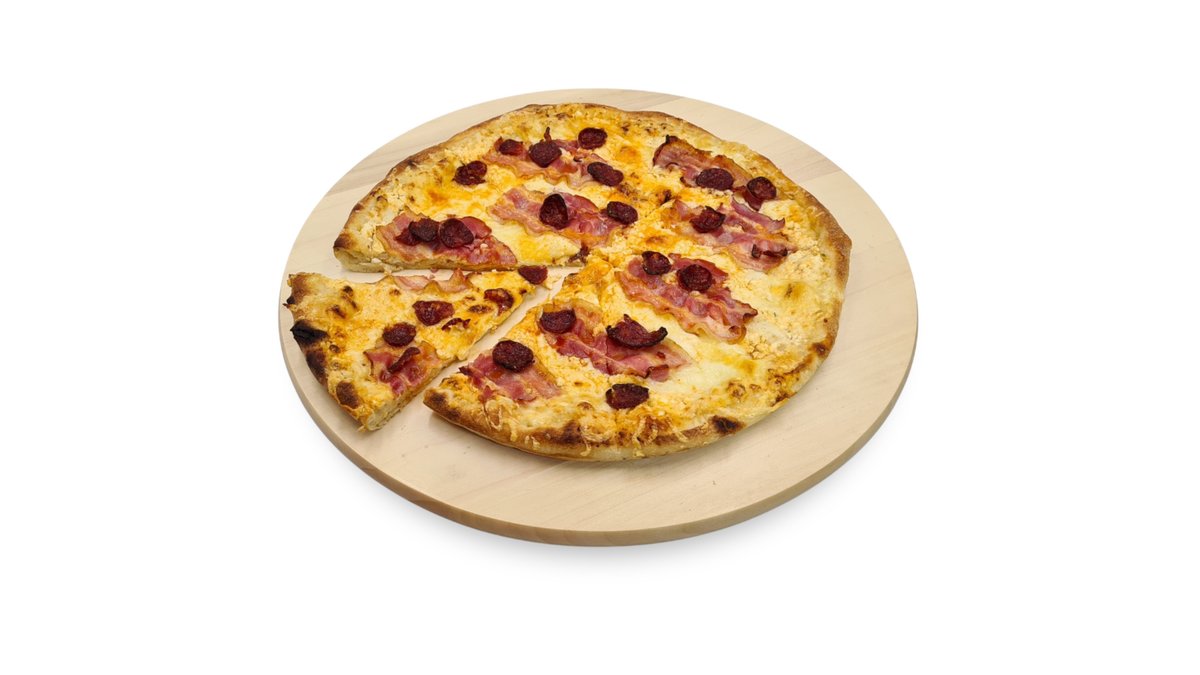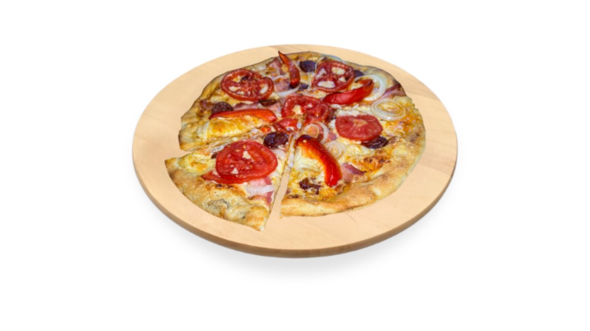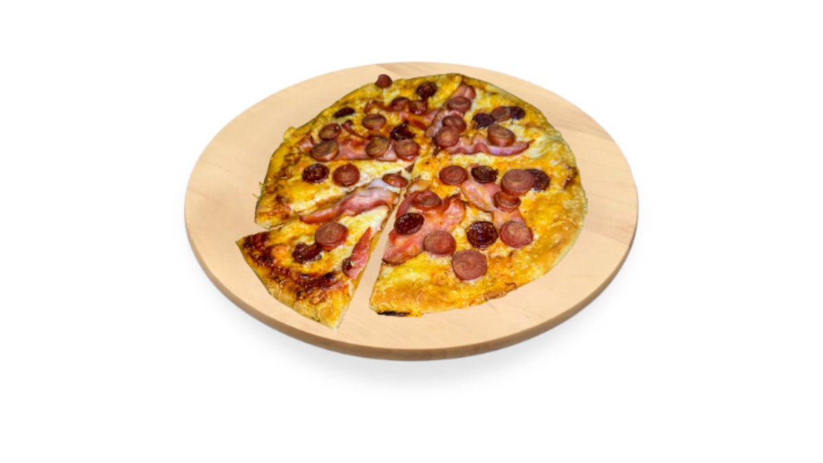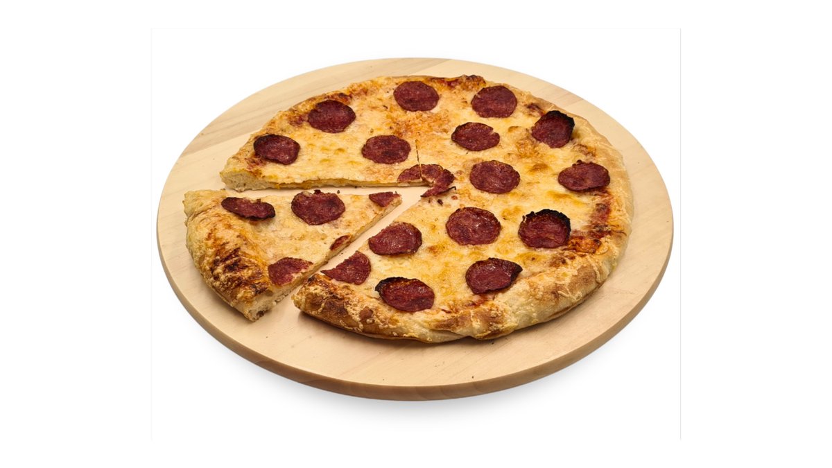 Paradicsomszósz, sajt, szalámi, morzsolt oregánó (nem szabályos kör alakú, 30 cm, vékony tésztás pizza)