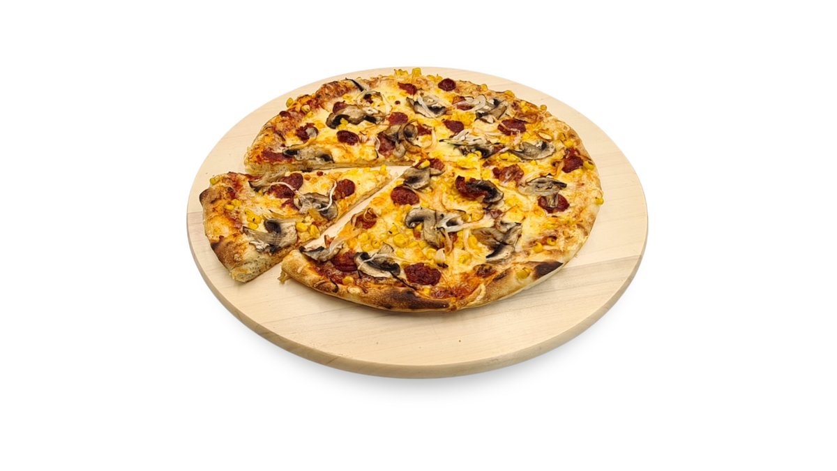 Paradicsomszósz, sajt, gomba, kukorica, hagyma, kolbász