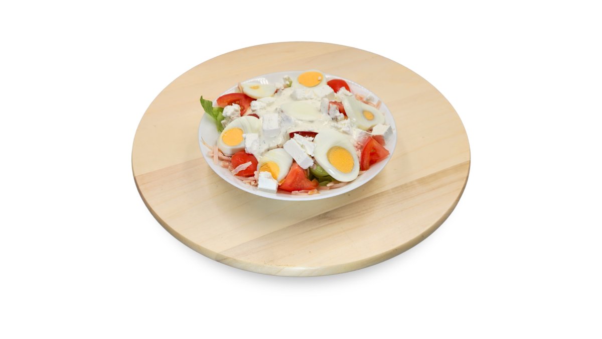 Főtt tojás, saláta, sonka, paradicsom, tzatziki, feta sajt