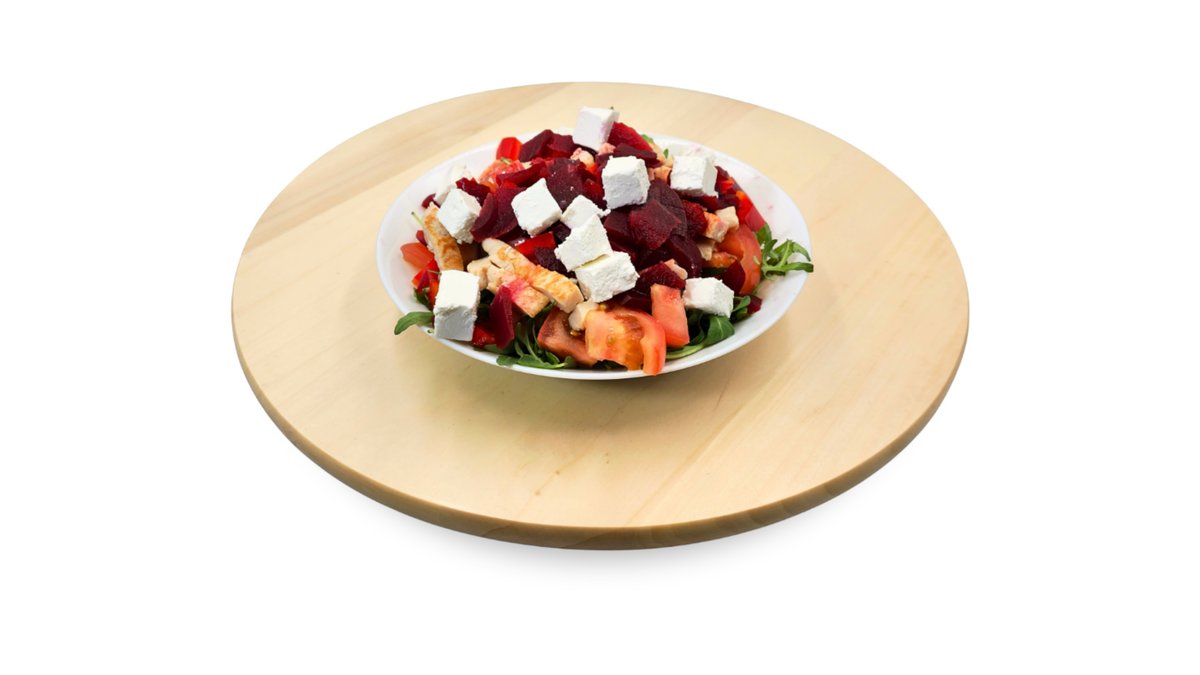 Paradicsom, paprika, rukkola, feta sajt, csirkemell csíkok, cékla