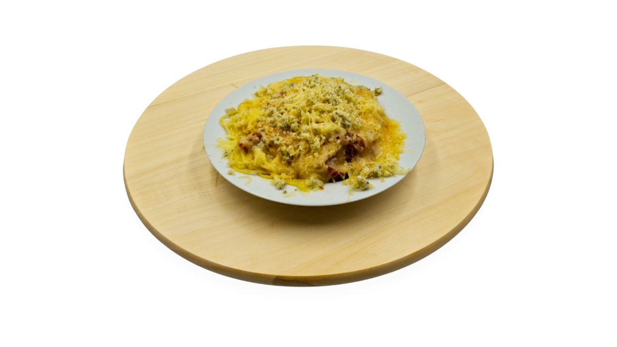 Spagettitészta, májkrémes-tejfölös-darálthúsos alap, sonka, sajt, gomba, hagyma, majonéz, chili, jalapeno paprika, fokhagyma