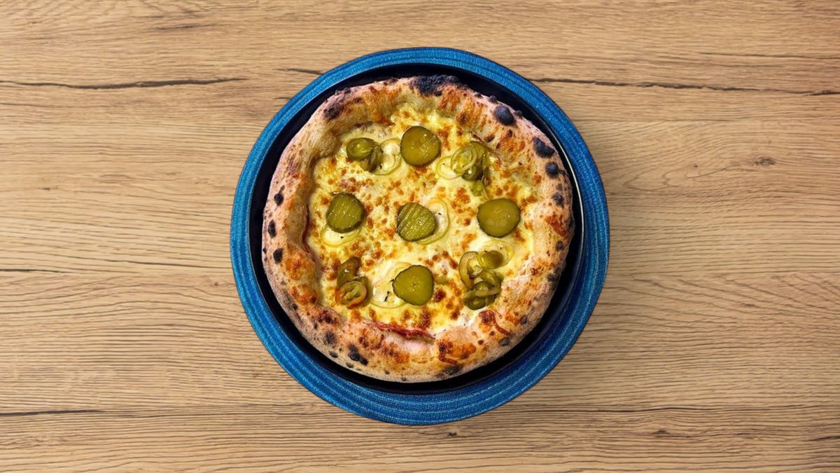 Paradicsomos jus alap, füstölt sajt, pepperoni, lilahagyma, csemegeuborka