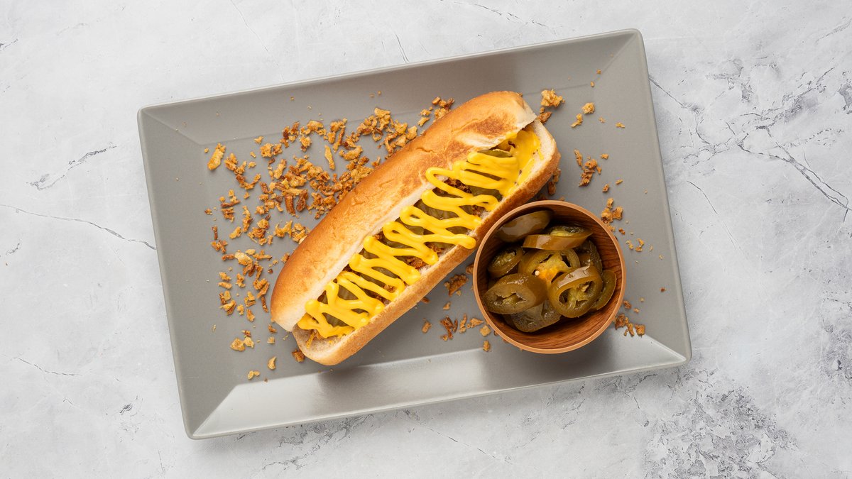 sajt, BBQ szósz, ketchup, majonéz, pirított hagyma, uborka, csalamádé, jalapeno