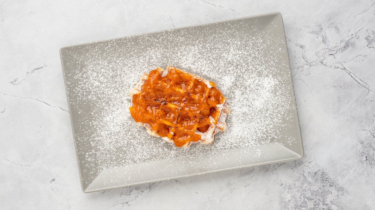 Ropogós cukros (jégcukor) gofri baracklekvárral.