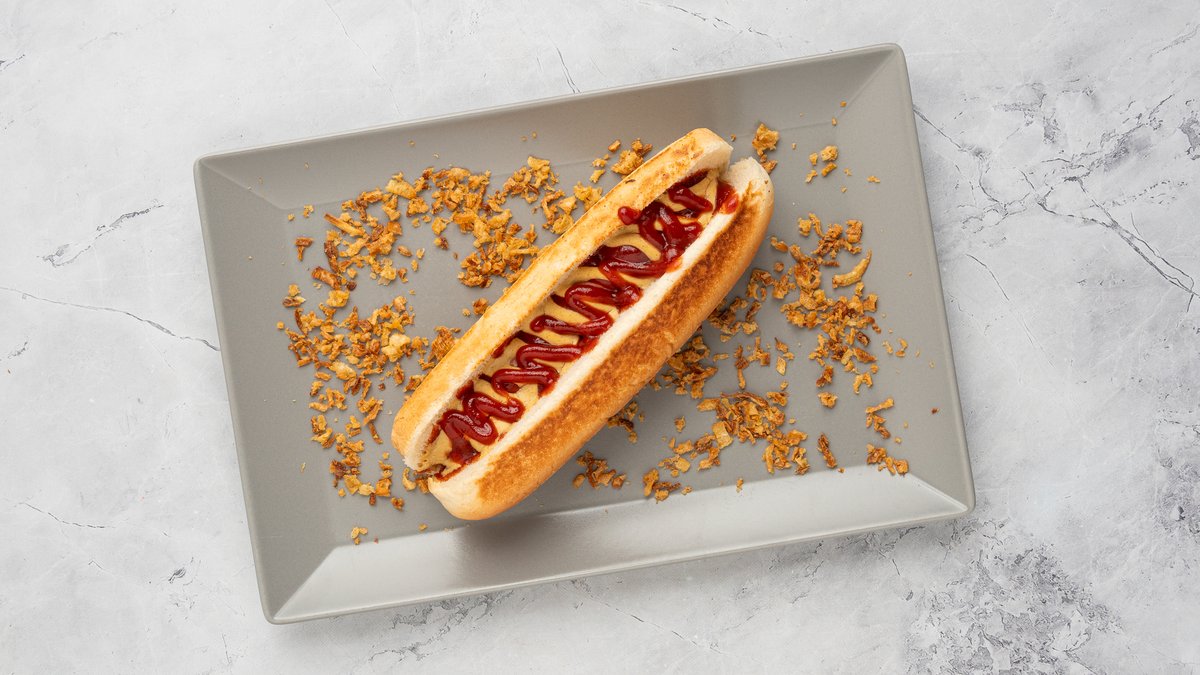 kifli, virsli, lila hagymalekvár, BBQ szósz, majonéz, cheddar sajtszósz, pirított hagyma, csemegeuborka, jalapeno paprika