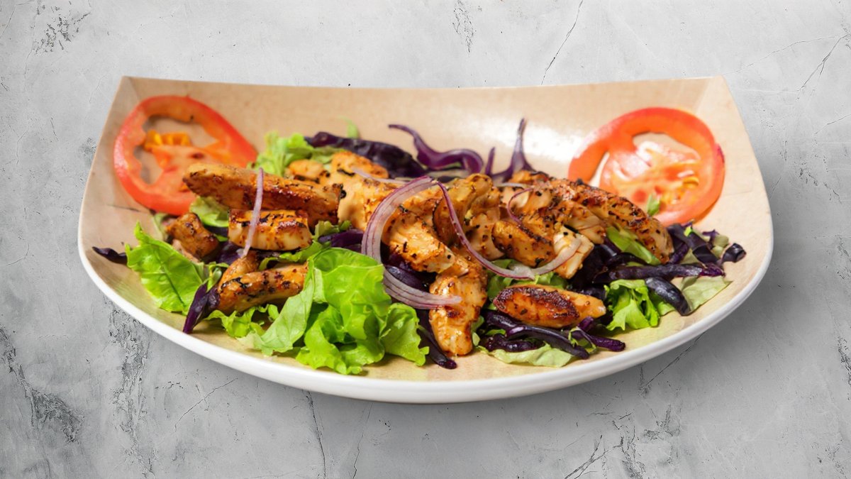 Ropogós rántott csirkemell, karamellizált hagyma, saláta, paradicsom, uborka, aioli szósz