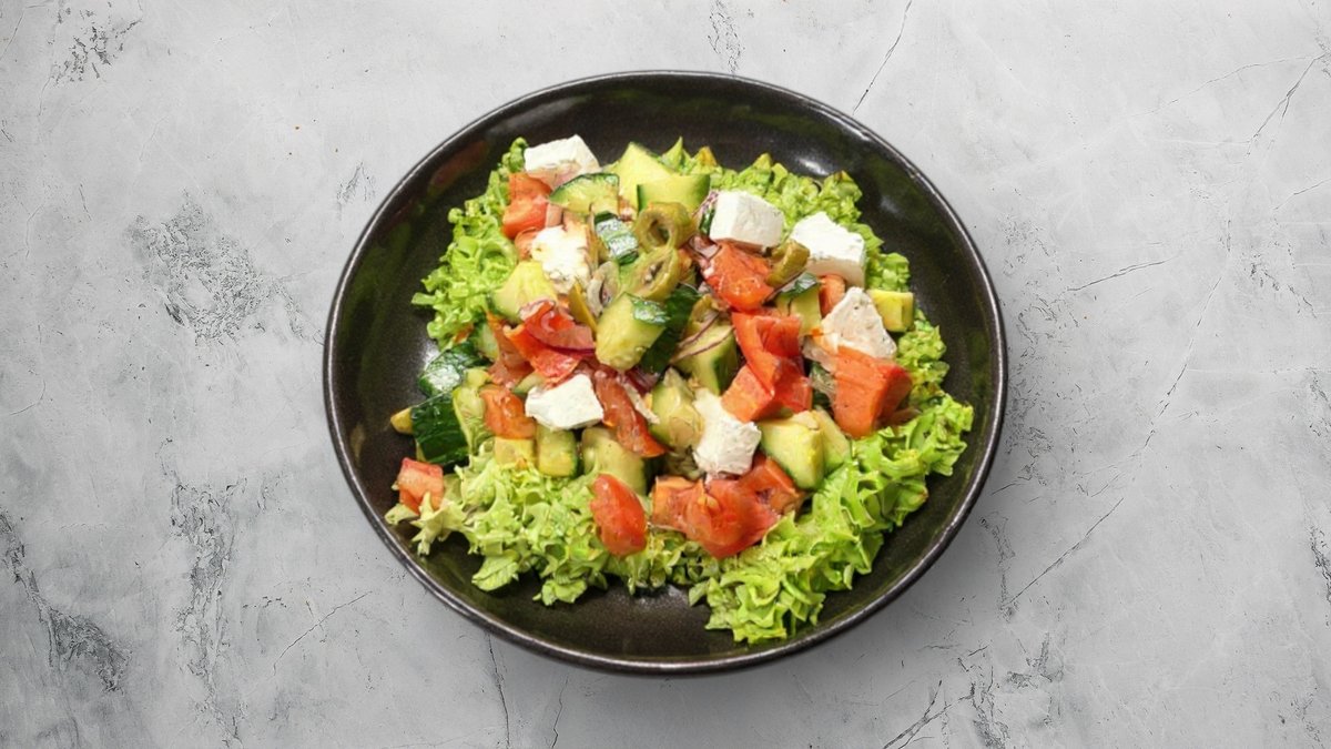 Saláta, paradicsom, uborka, oljabogyó, lilahagyma, feta sajt