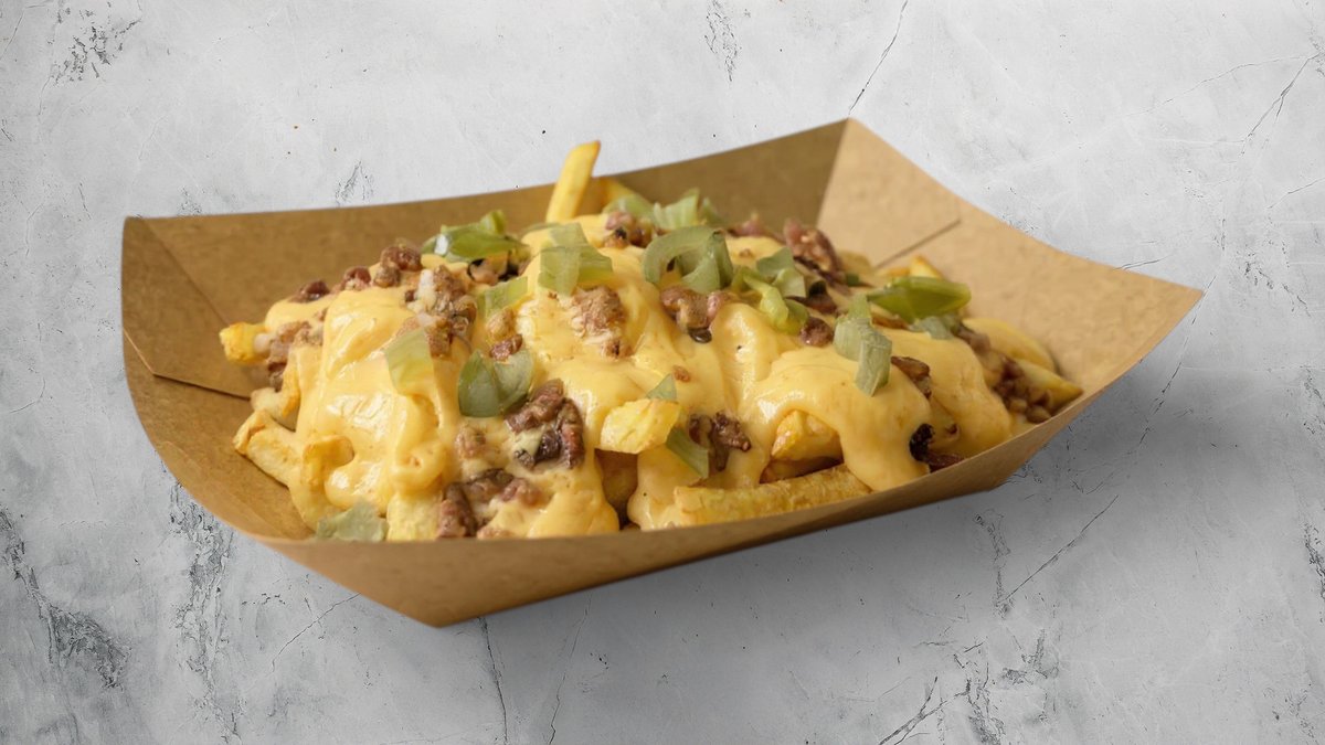 Pulled prok hús, pirított bacon szórás / pirítotthagyma szórás, sajt szósz, jalapeno szósz/ salsa szósz, sült burgonya. Mr's Smoke BBQ készítmény.