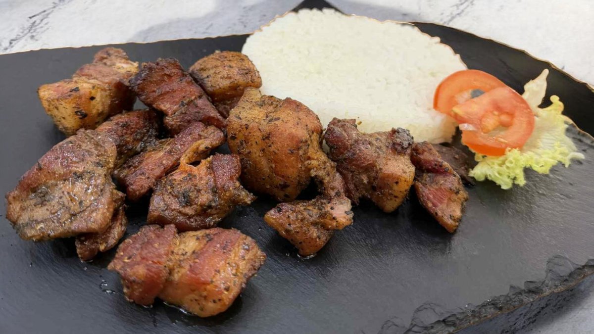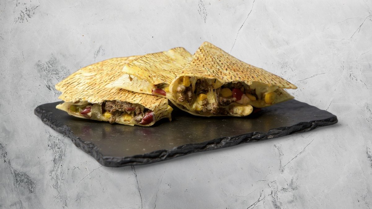 Fűszeres pirított marhahús, jalapeno, saláta, BBQ szósz, sajt, zöldséges rizs