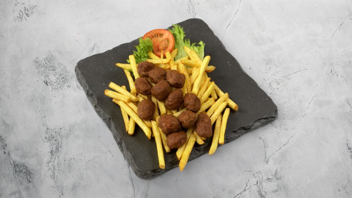 Grillezett sajt, paradicsom, saláta, uborka, sajtszósz, hasábburgonya
