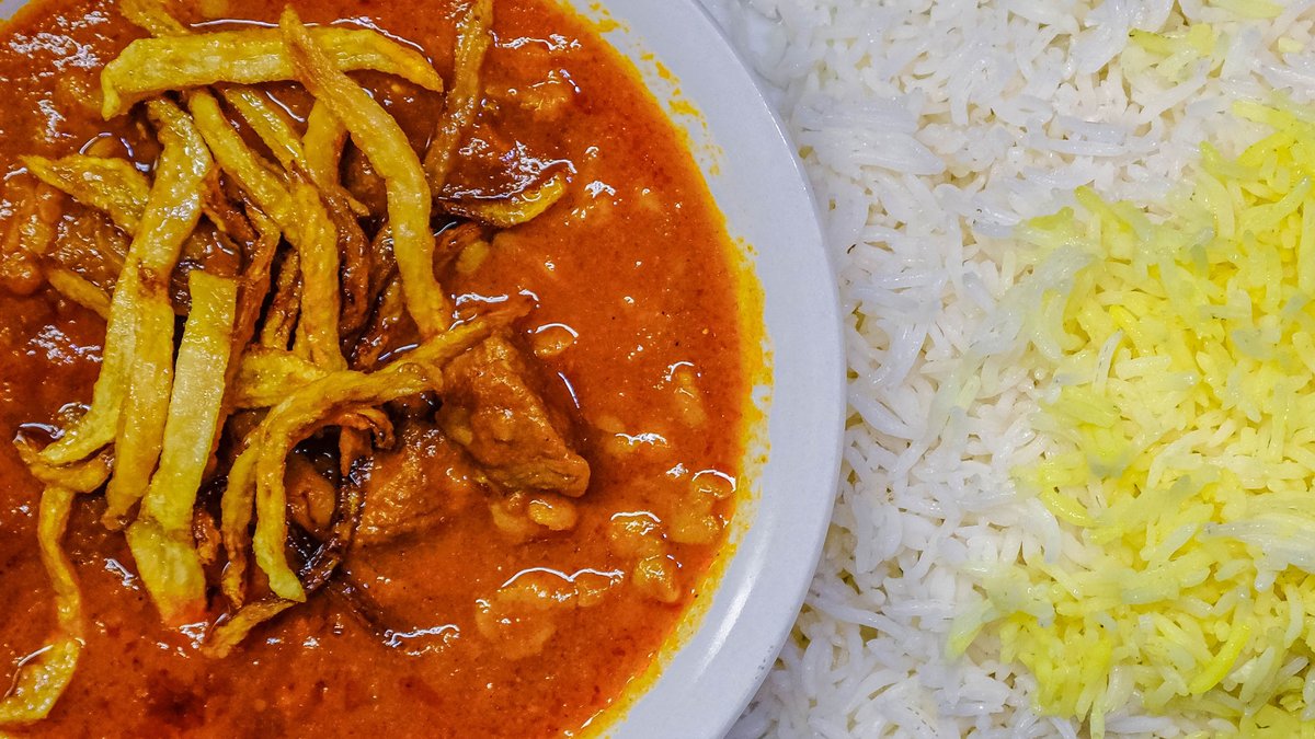 Felesborsós Marhapörkölt Sáfrányos Basamati Rizzsel, Sült krumplival