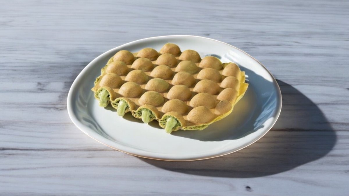 Freshly baked rounded waffle on sticks mixed with matcha powder, 100% handmade and fresh.