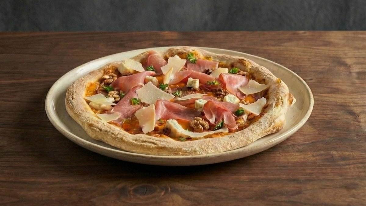 paradicsomszósz, cotto sonka, bacon, póréhagyma, gorgonzola, mozzarella